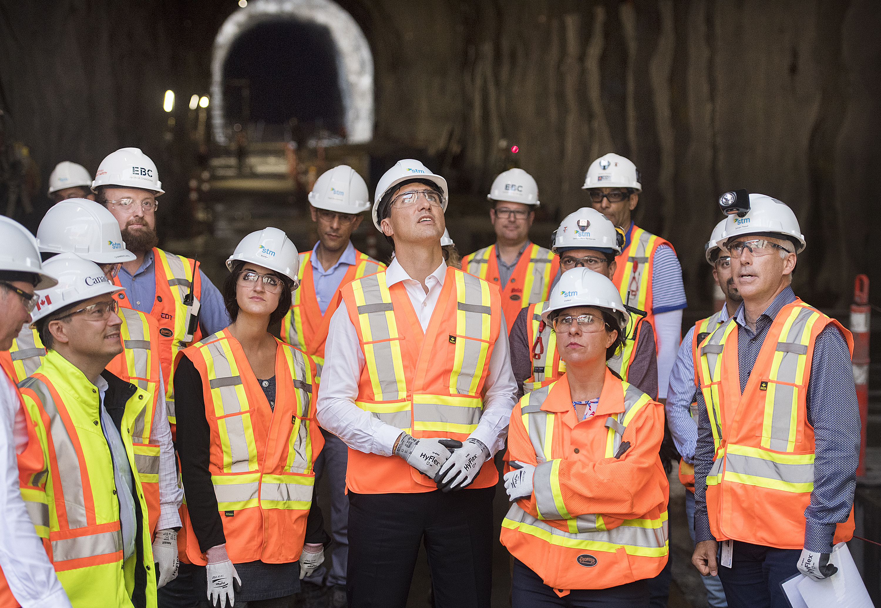 Prime Minister Justin Trudeau, centre, with Montreal Mayor Valerie Plante, second right, and local politicians and engineers visits a worksite for an STM maintenance garage in Montreal, Thursday, August 9, 2018. THE CANADIAN PRESS/Graham Hughes