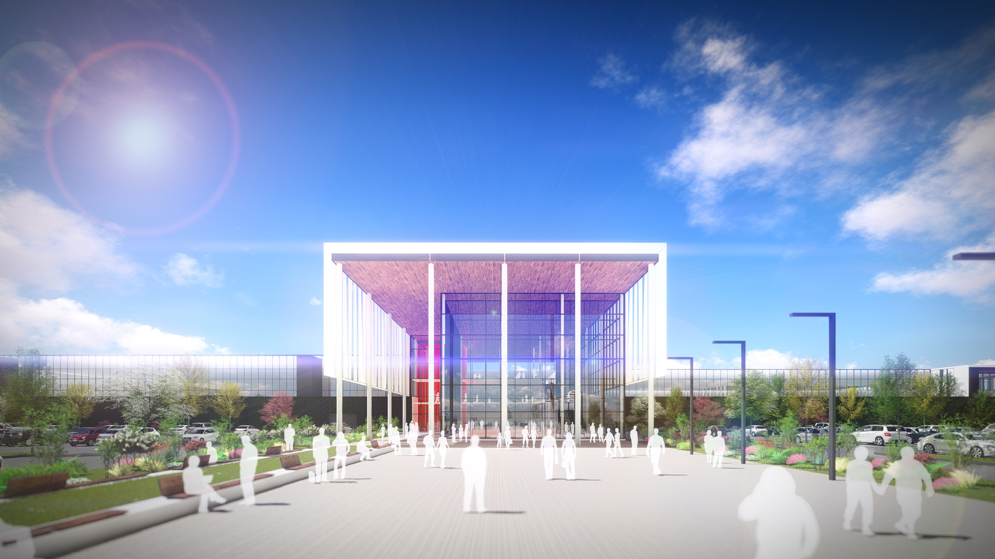 L’atrium, en forme de cube, avancerait sur une allée piétonne prolongée jusqu’au boulevard Thimens. Il servirait surtout aux employés venant en autobus, mais pourrait également accueillir une aire commune.