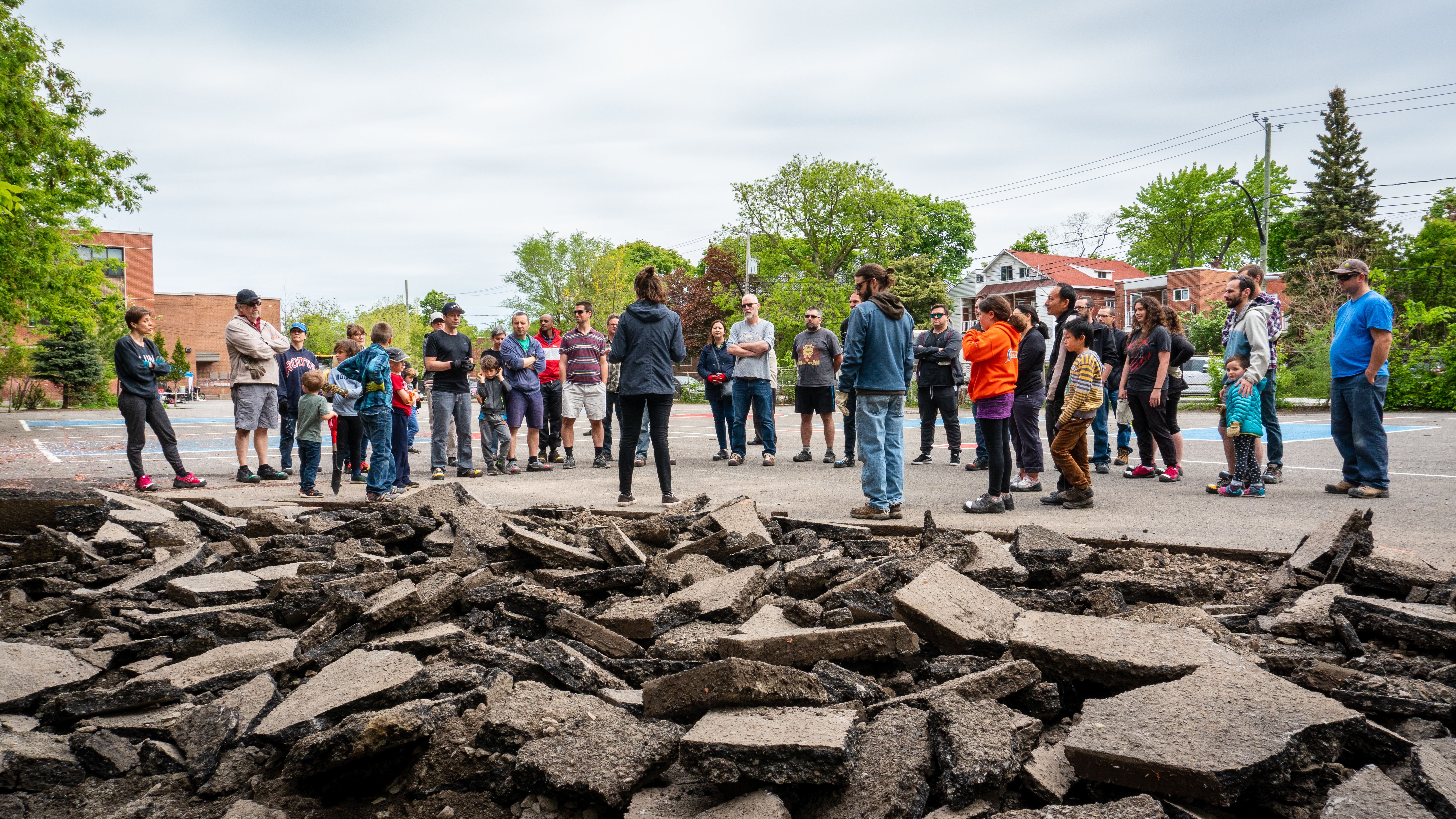 Une trentaine de citoyens, enfants comme adultes, se sont réunis dans la cours de l’école alternative Jonathan pour briser des blocs d’asphalte.