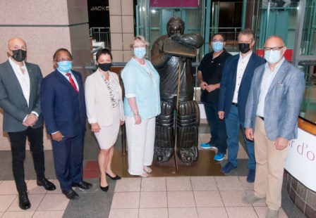 La statue grandeur nature du gardien intronisé au Temple de la renommée du hockey a été commandée en 1984 par le PDG de Cambridge Leasehold, Lorne Braithwaite.