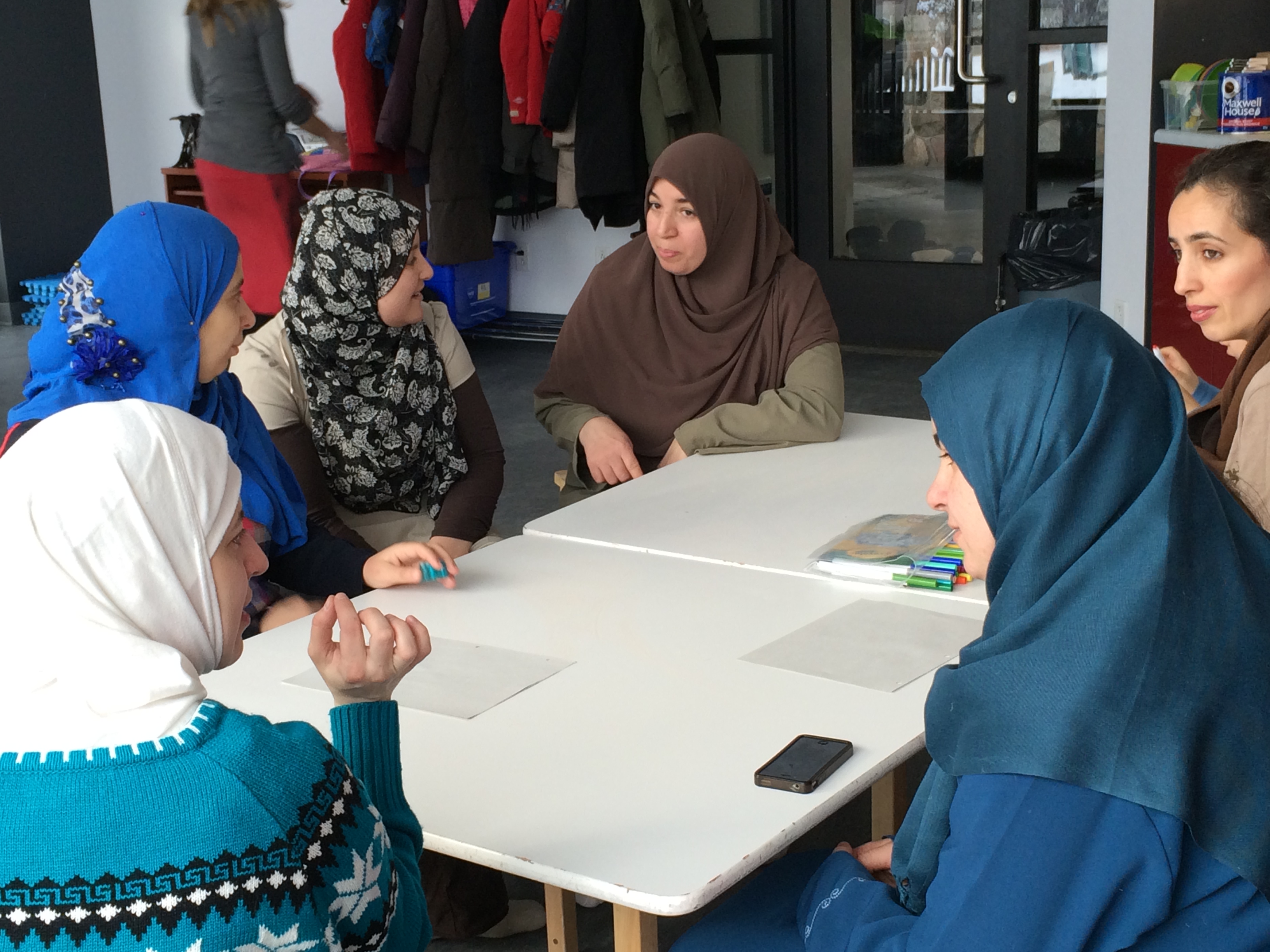 Sur une table dans un coin de la pièce, des femmes, majoritairement voilées, discutent de leur vie familiale, s’échangent des conseils, et partagent les nombreux obstacles qu’elles rencontrent.