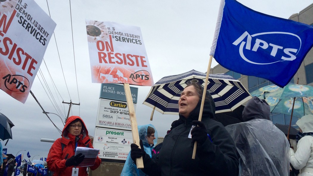 Quelque 100 employés ont bravé la pluie pour brandir drapeaux et pancartes aux abords du boulevard Henri-Bourassa vendredi. «Ils démolissent nos services, on résiste», pouvait-on lire sur les pancartes qui se glissaient entre les nombreux drapeaux bleus de l’APTS, l’Alliance du personnel professionnel et technique de la santé et des services sociaux.