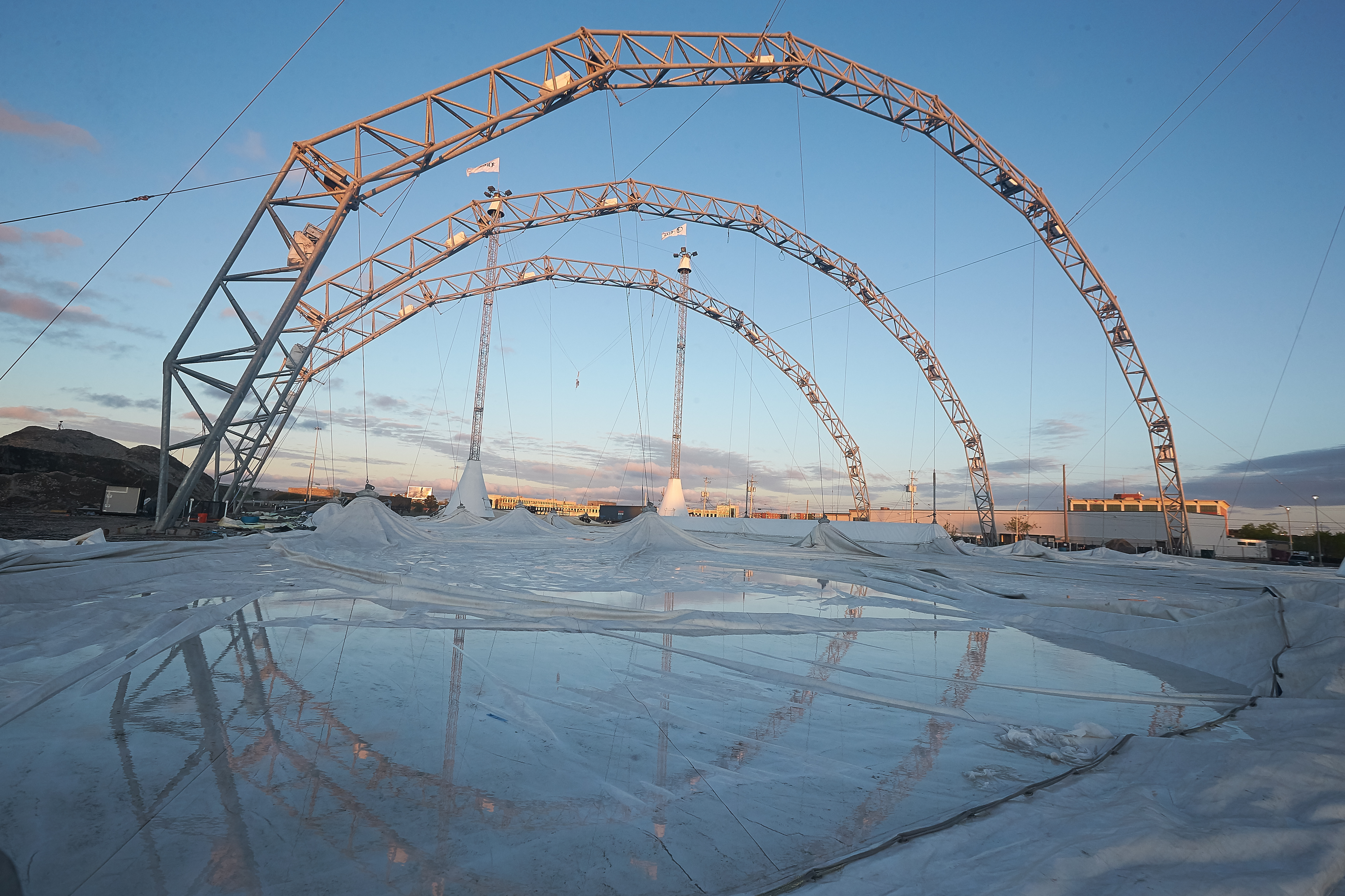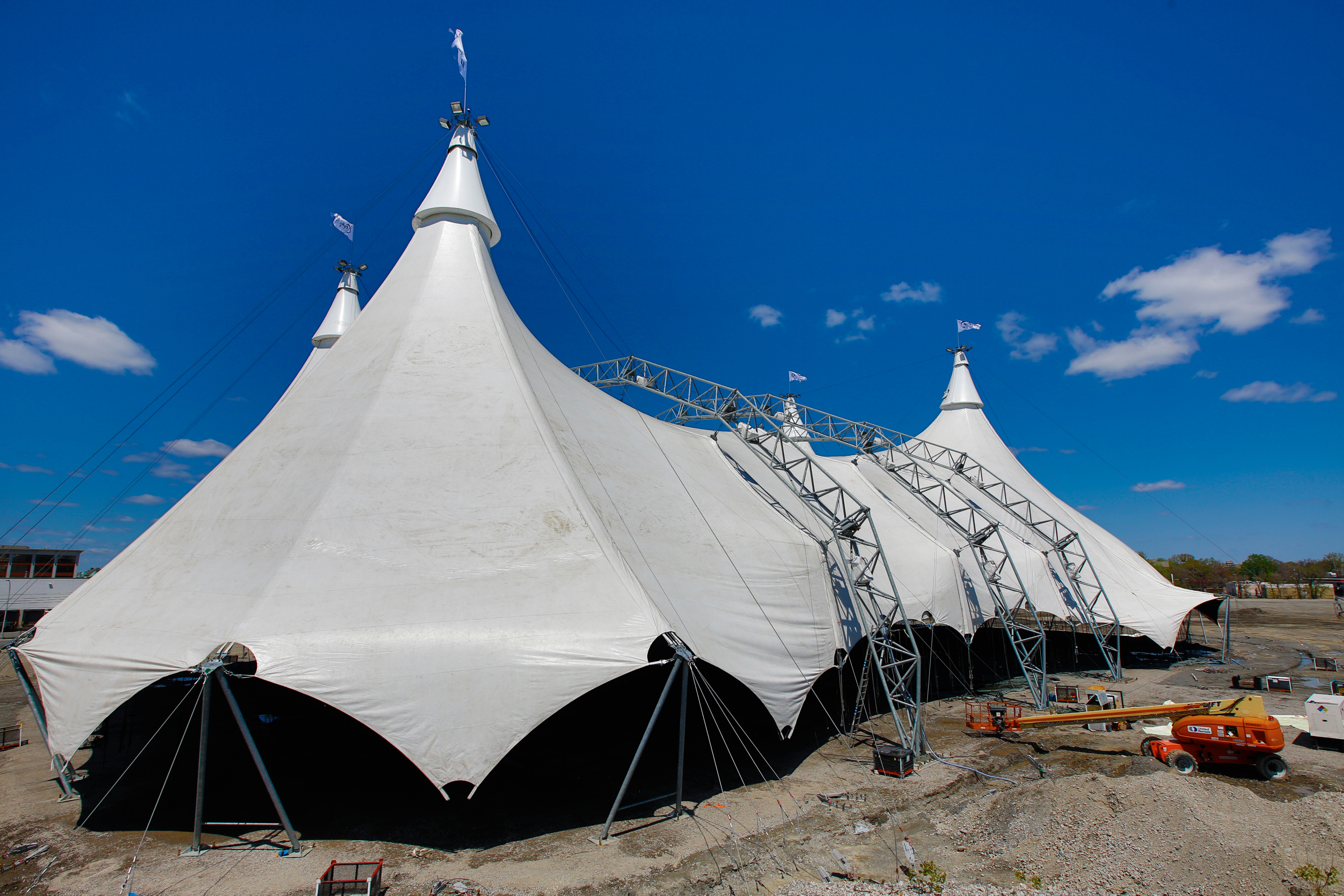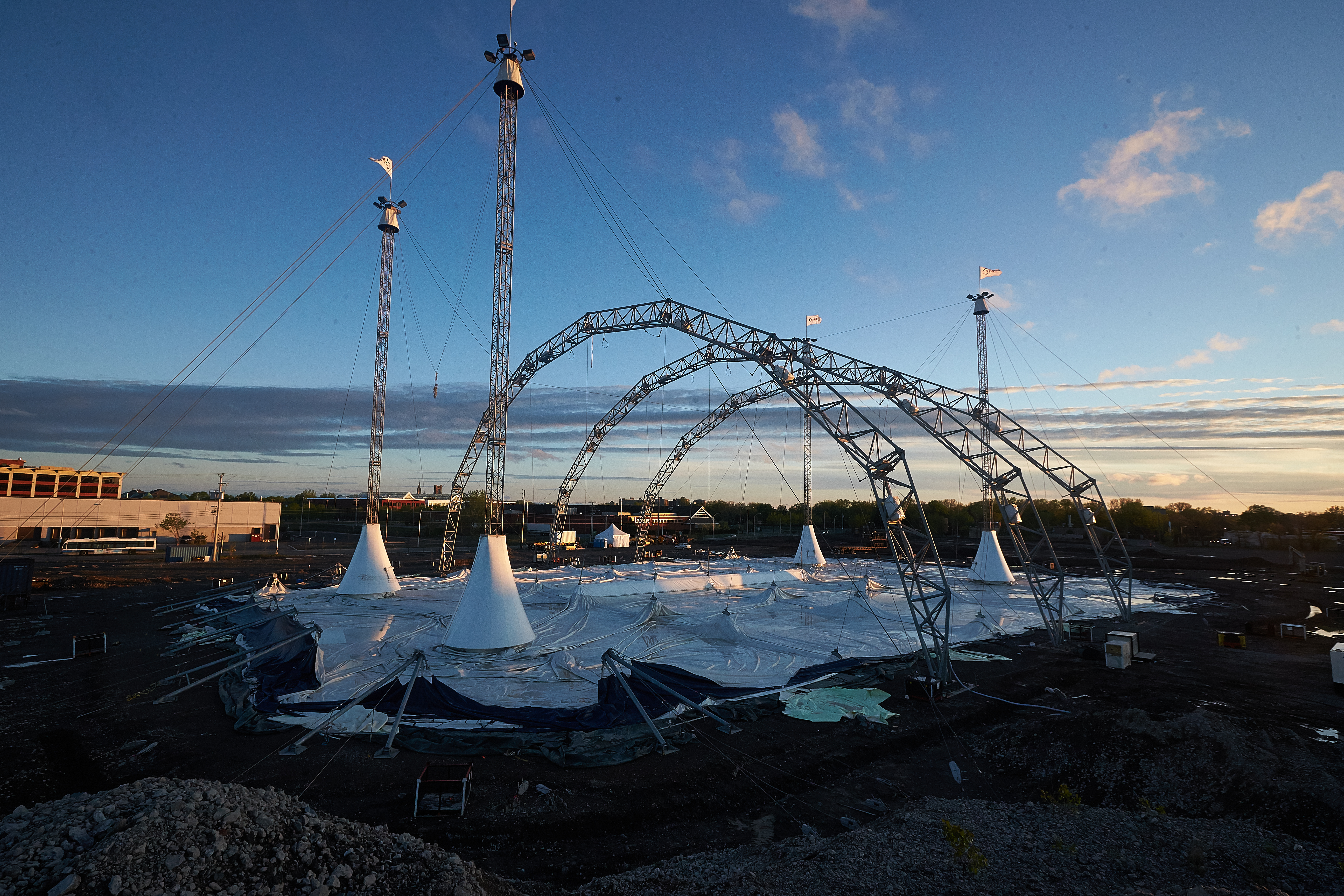 À l’aube, les équipes étaient en place pour installer le chapiteau de 9 910 mètres carrés. En quelques heures, une soixantaine de travailleurs, assistés de 33 moteurs, ont hissé aux trois imposantes arches métalliques la toile de 16 pièces lacées. On se retrouve alors devant une installation haute de 10 étages.