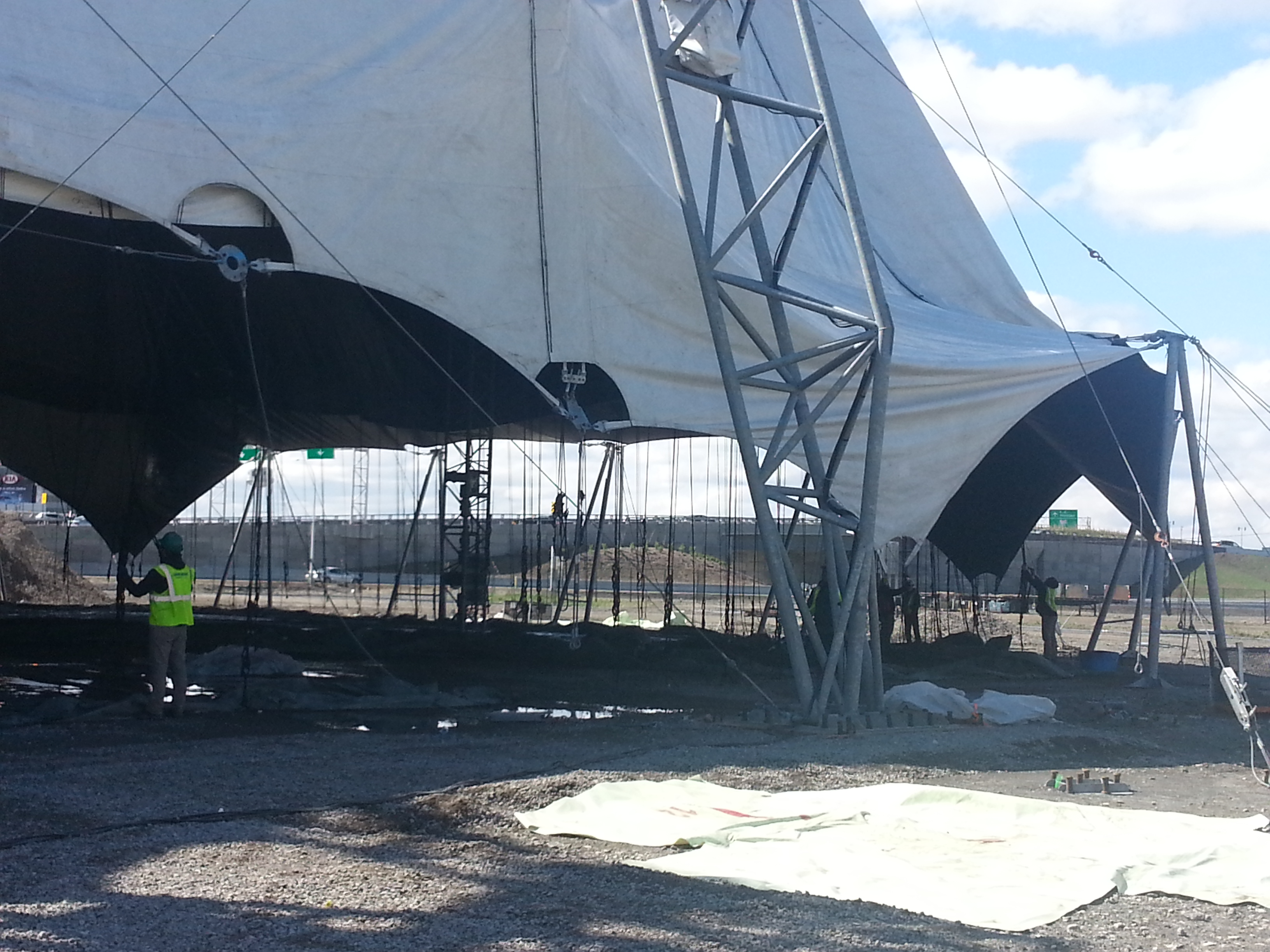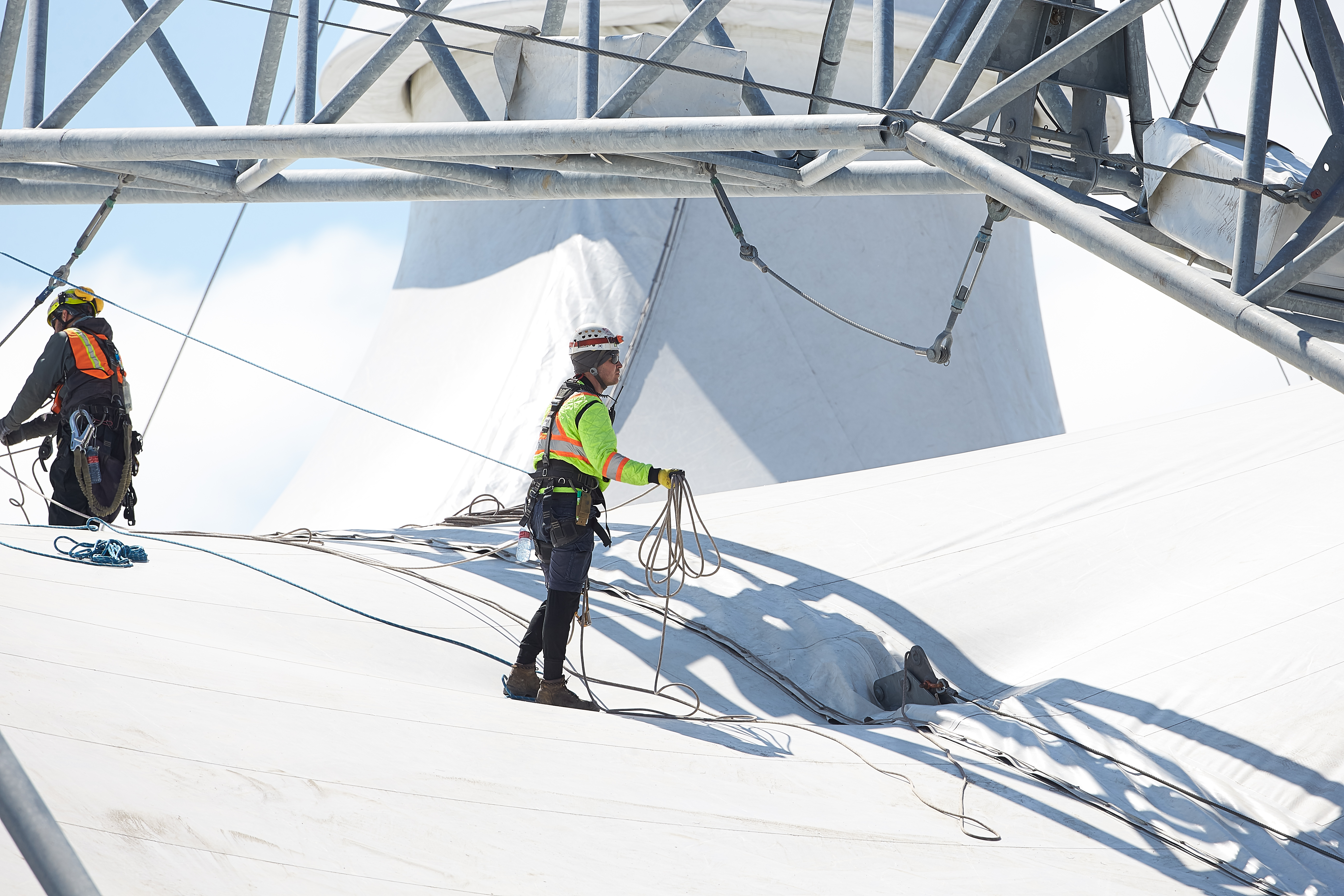 La veille, la toile a été déroulée minutieusement, sans trop la soulever pour éviter qu’elle se transforme en immense parachute et qu’elle s’envole. Maintenu au sol par des câbles d’acier d’une longueur totale de 5,8 km (soit la distance entre le Stade olympique et le parc du Mont-Royal), 1 300 piquets et 250 plaques d’ancrage, le chapiteau maintenant érigé peut soutenir des rafales pouvant atteindre jusqu’à 130 km/heures.