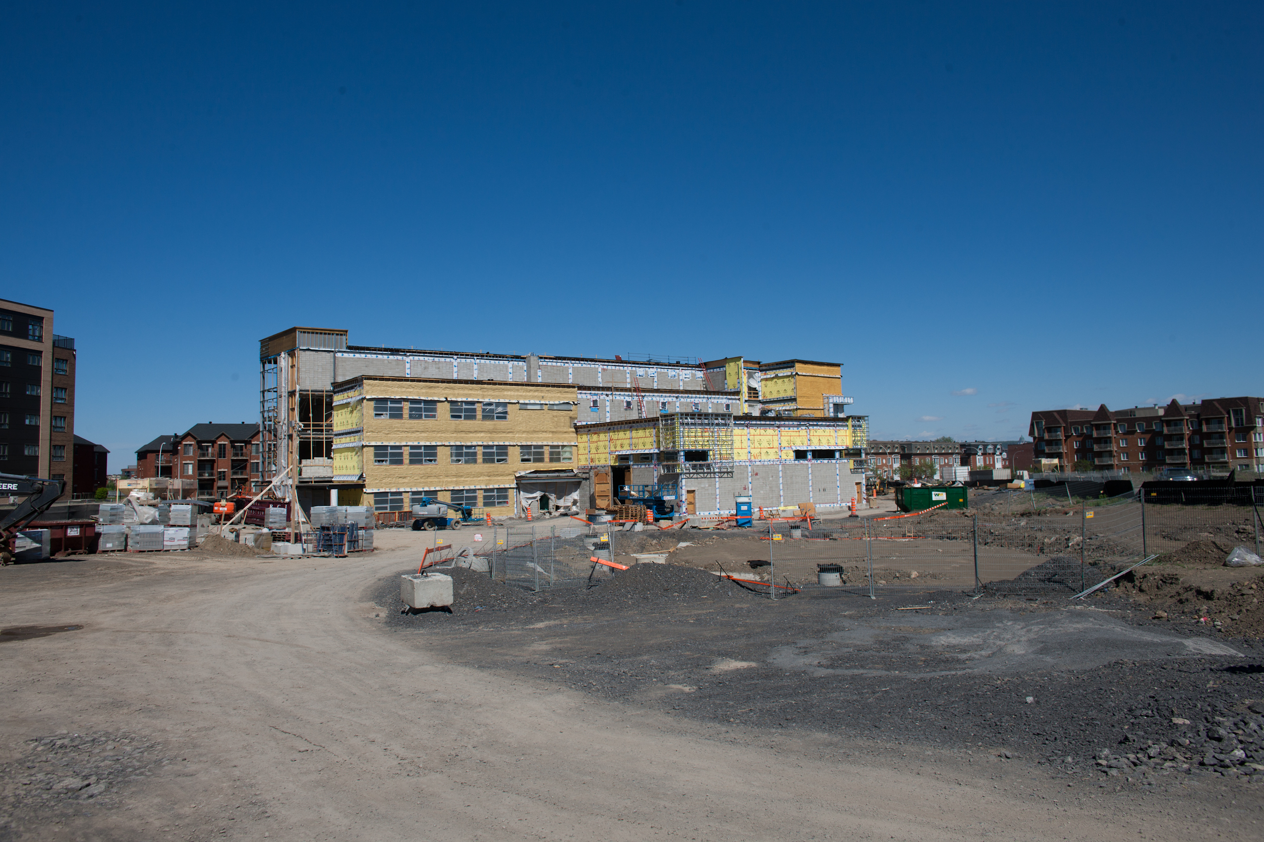 Pour l’instant, l’extérieur est loin d’être terminé. Lors de la visite de TC Media mercredi, les cages d’escaliers restaient à être emmurées et le recouvrement posé. La cour d’école ressemble encore à un immense carré de sable avec bien des camions, des bétonnières et des équipements divers.