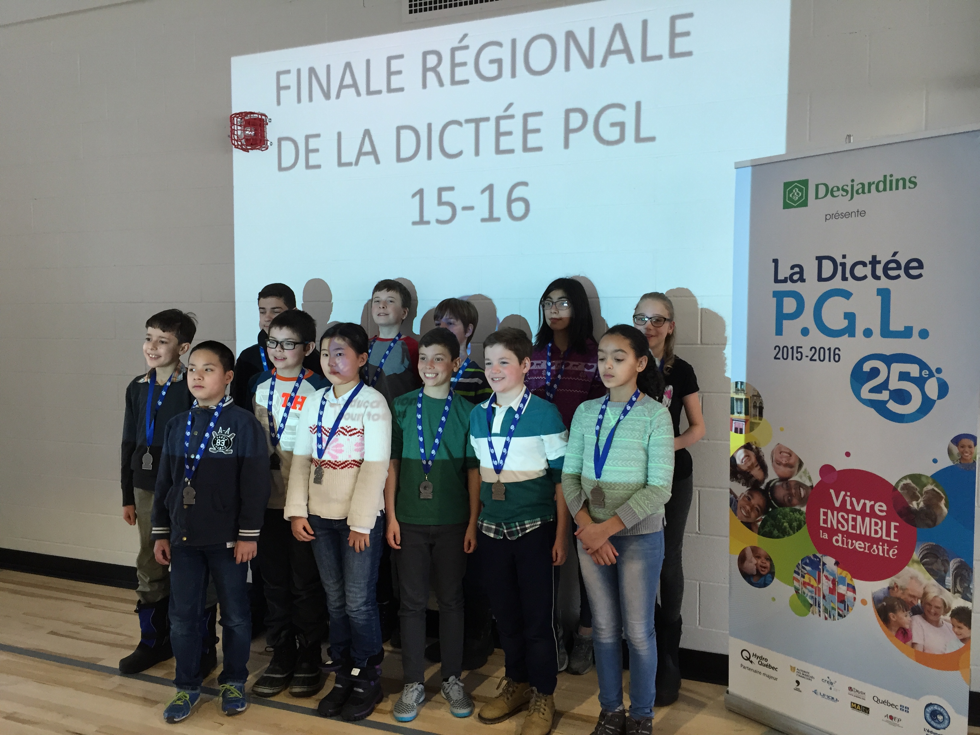 Un élève de 6e année de l’école primaire Édouard-Laurin, de la rue Tassé à Saint-Laurent, participera à la grande finale internationale de La Dictée P.G.L. de la Fondation Paul Gérin-Lajoie, le 29 mai à Québec. Vincent Kwan (2e en partant de la gauche) fait partie des 12 gagnants de la finale régionale du 12 mars à Montréal.