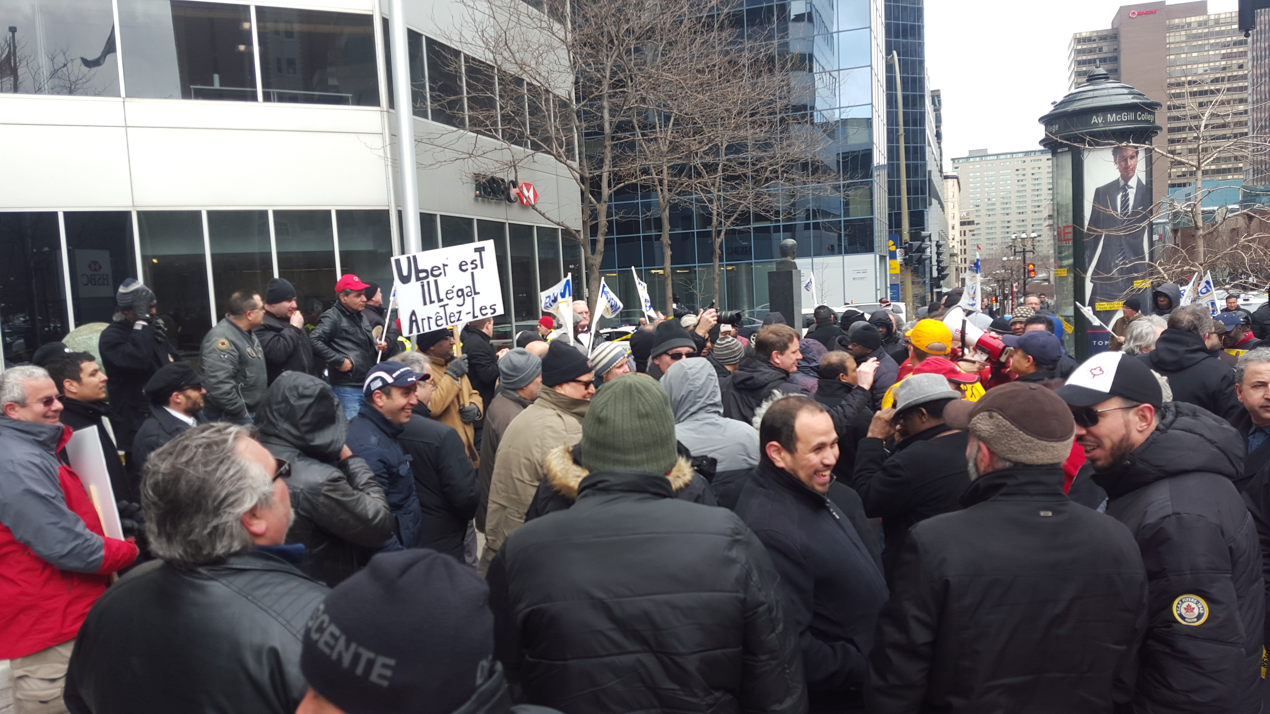 Upwards of 400 taxis gathered in Saint-Laurent’s Technopark and convoyed to the front of Premier Philippe Couillard’s downtown office on Friday to protest the government’s lack of Uber legislation. New law on the ride-hailing service was expected to be drafted at the end of March after public hearings wrapped.