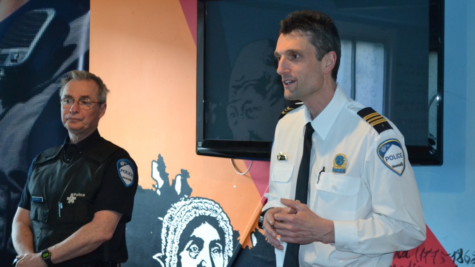 Il est un peu avant 19h, mercredi soir, au centre communautaire Bon Courage, rue Place Benoît, à Saint-Laurent. Cinq agents du poste de quartier 7 du Service de Police de