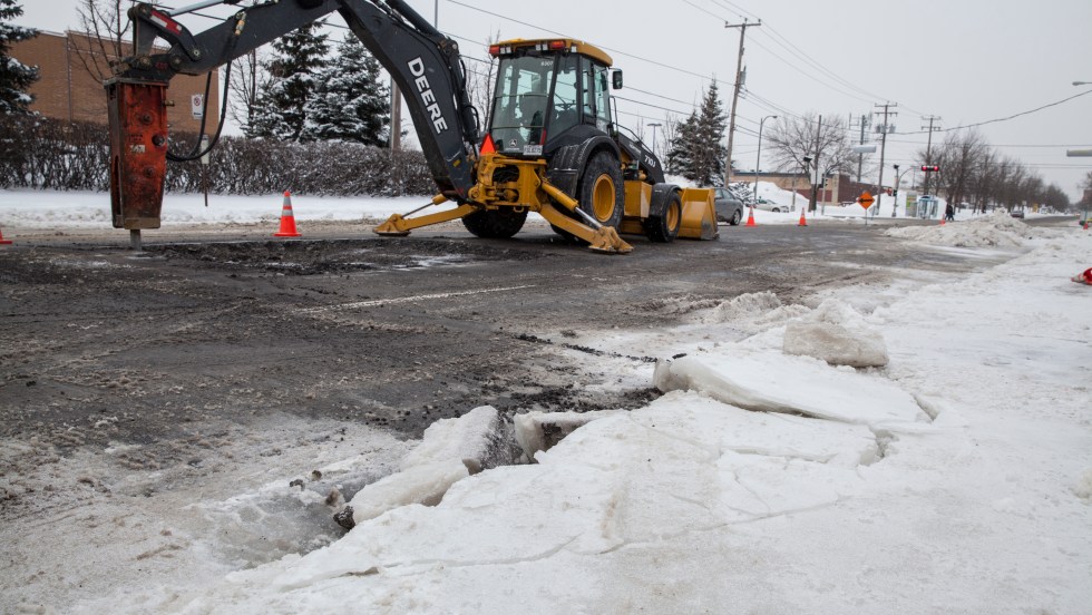 Le froid polaire qui s’est abattu sur Montréal a causé un bris d’aqueduc sur la rue Grenet, entre les rue Deguire et Poirier, à Saint-Laurent. Les travaux, en cours depuis
