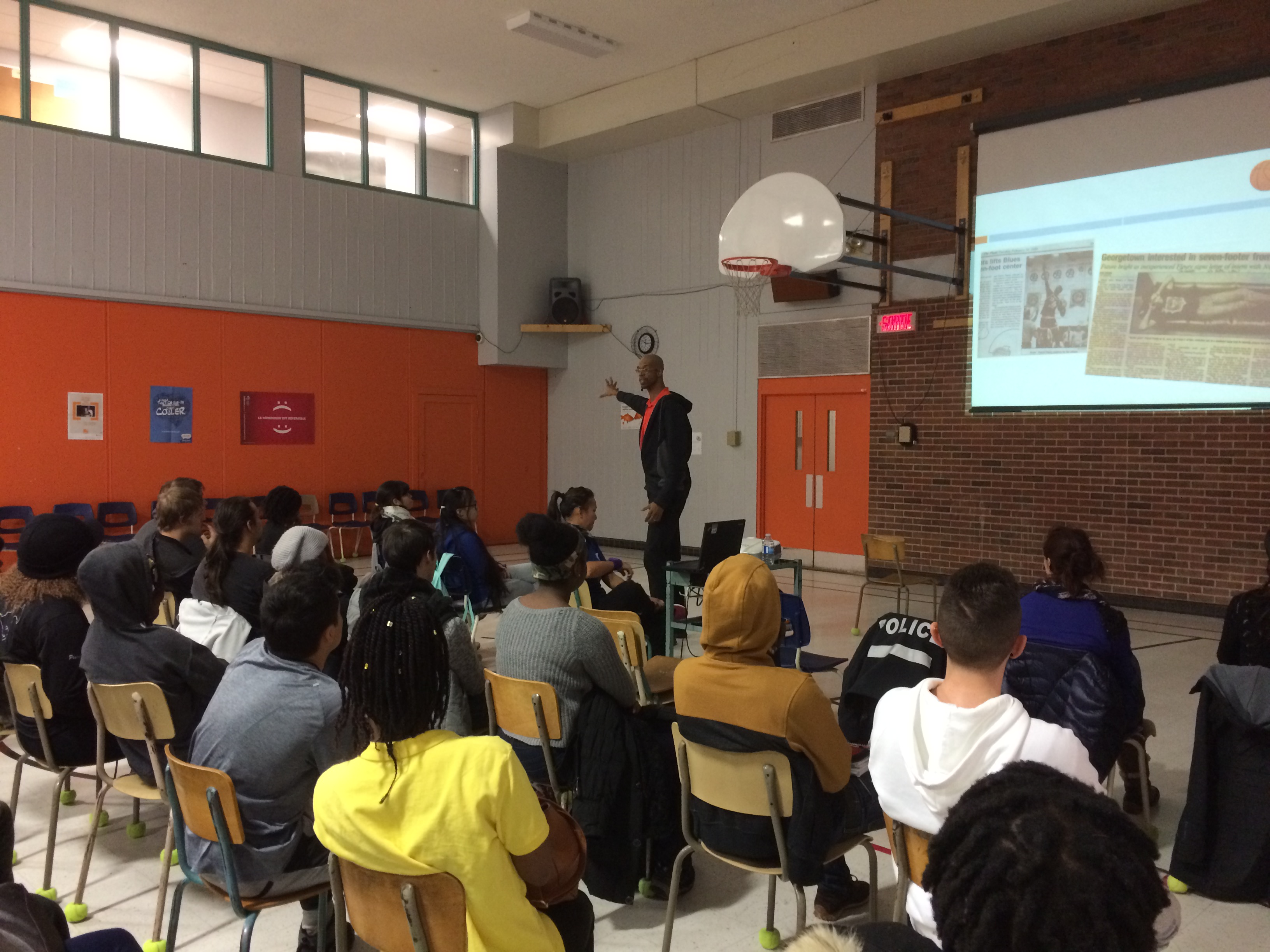 Après la conférence, les jeunes ont affronté les policiers de Saint-Léonard dans un match de basketball, accompagnés de l’ancien athlète de 7 pieds 2 pouces (2m18).