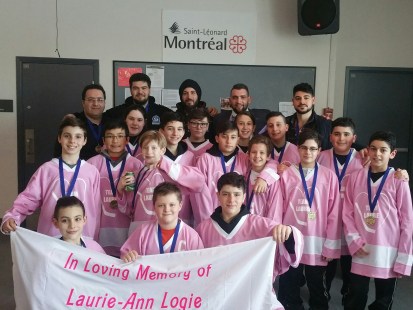 Vêtus de rose, des joueurs des Cougars de Saint-Léonard ont disputé un match amical aux Dragons de St-Donat/RDP en mémoire de la mère d’un joueur d’une autre équipe.