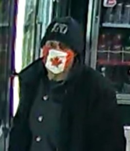 Au moment du vol, il portait une tuque noire avec l’inscription 67, un masque rouge et blanc représentant le drapeau du Canada, un manteau noir avec une carte d’employé sur le côté droit du manteau, une chemise grise, un pantalon et des souliers noirs ainsi qu’une bague à la main gauche.