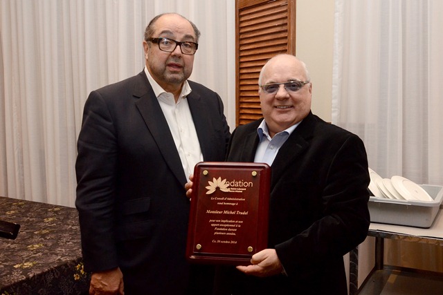 À cette occasion, M. Trudel s’est vu remettre une plaque hommage soulignant sa longue implication au sein de la Fondation. Au total, la soirée bénéfice a permis d’amasser près de 10 000 $, un montant qui permettra d’organiser des activités avec les résidents des trois centres d’hébergement du territoire et à des projets en CLSC auprès de la clientèle qui reçoit du CSSS de Saint-Léonard et de Saint-Michel.