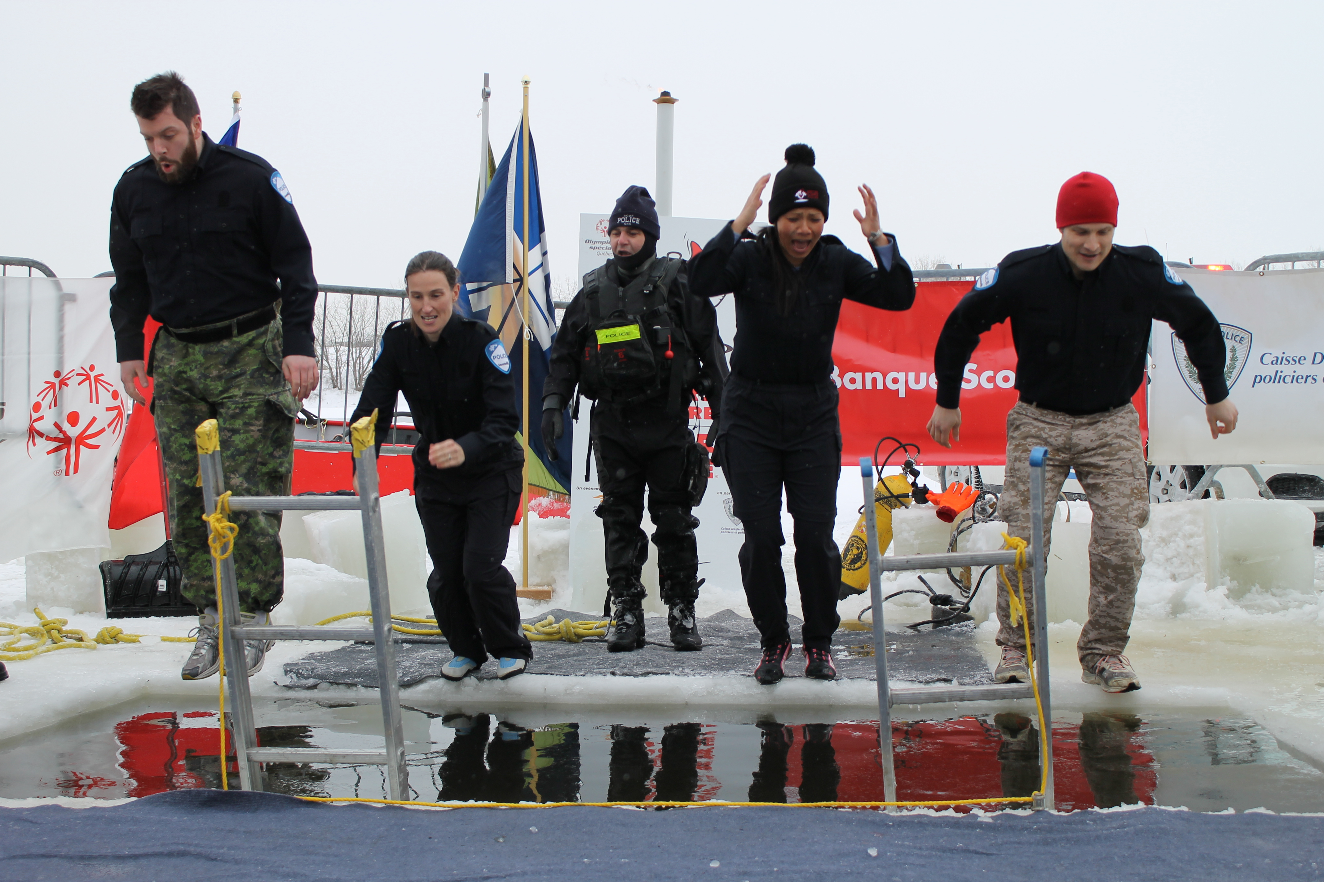 Une dizaine de policiers du poste de quartier de Saint-Léonard ont sauté dans les eaux glacées du fleuve Saint-Laurent, le 7 février, afin de relever le Défi de l’ours polaire, au profit des Olympiques spéciaux Québec (OSQ).