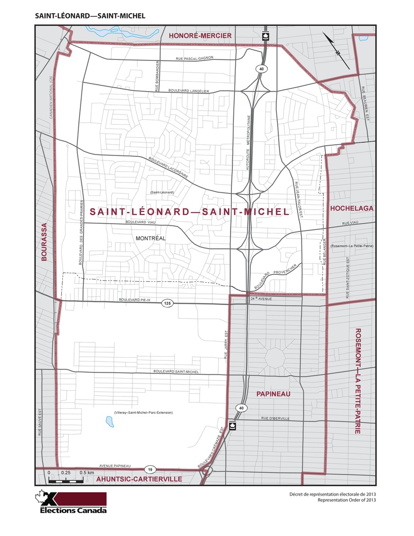 Les limites de la circonscription ont changé. La circonscription voisine Papineau a gagné le territoire s’étendant de la 19e à la 24e avenue entre les rues Bélanger et Jarry Est. Saint-Léonard – Saint-Michel s’est toutefois agrandie vers le nord-ouest jusqu’au chemin de fer longeant le boulevard Industriel et la rue de Port-Royal Est et vers le sud-ouest jusqu’à l’avenue Papineau.
