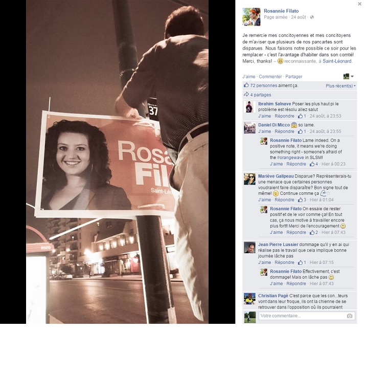 Rosannie Filato, la candidate en question a dénoncé l’incident mardi sur sa page Facebook, affirmant avoir dû réinstaller des pancartes cette semaine, après que des citoyens l’aient avisée des disparitions.