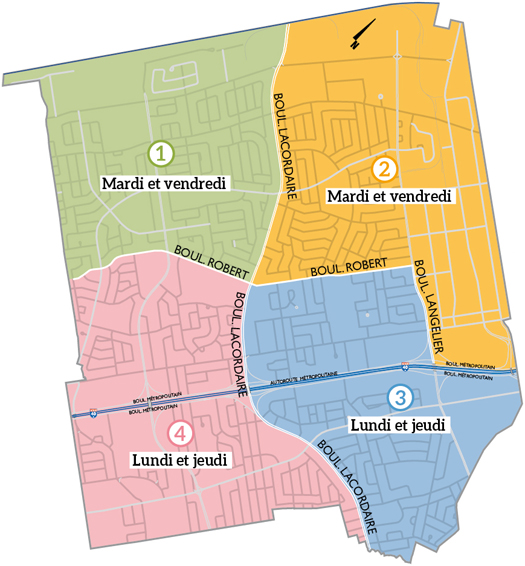 Les résidents situés au nord du boulevard Robert et à l’ouest du boulevard Langelier (secteur 1), ainsi que les résidents situés au nord de l’autoroute Métropolitaine et à l’est du boulevard Langelier (secteur 2) devront sortir leurs ordures ménagères les mardis et vendredis, plutôt que les lundis et jeudis.