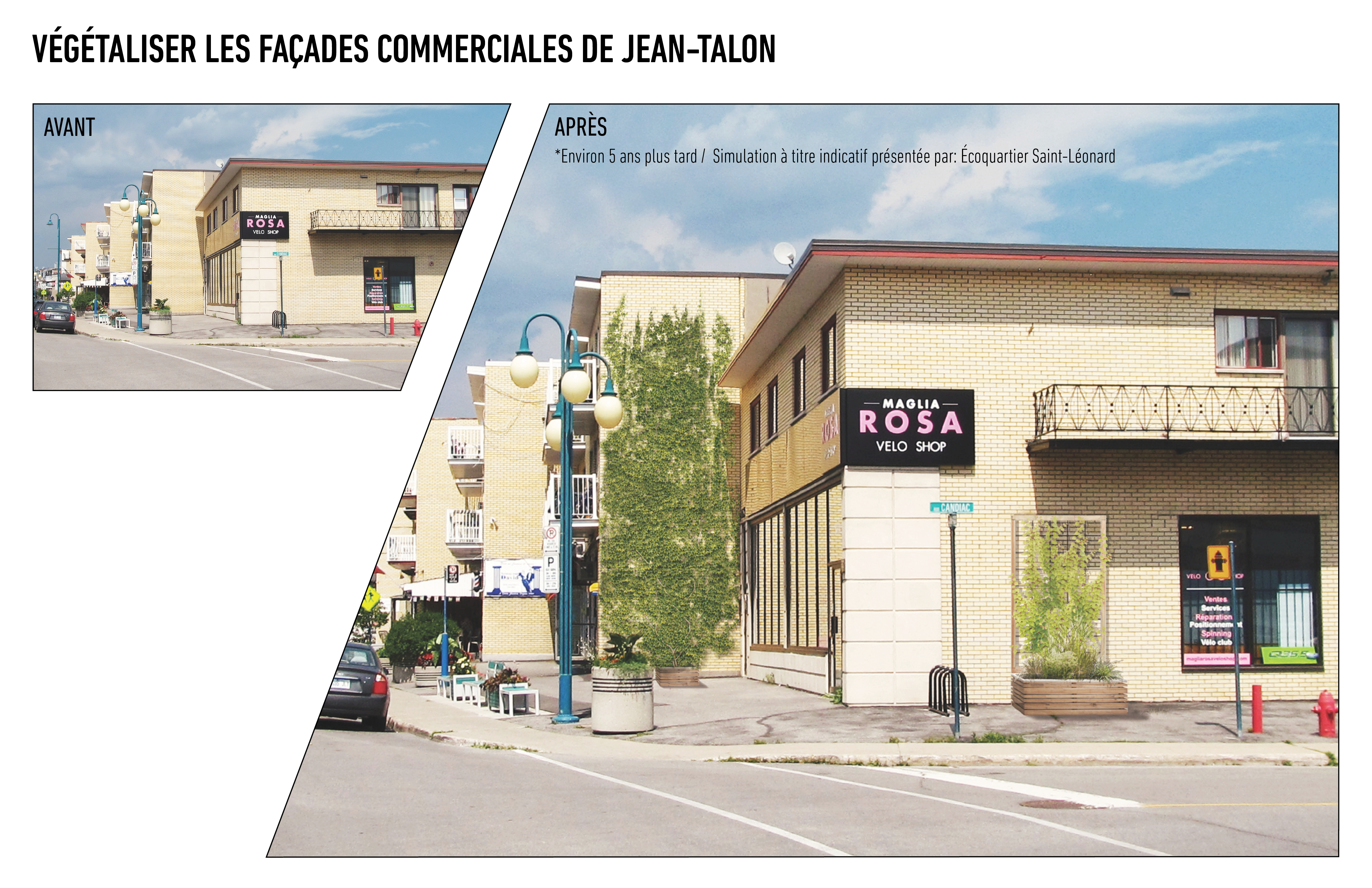 L’Écoquartier de Saint-Léonard a mis en place un projet pilote afin de reverdir la rue Jean-Talon, entre les boulevards Lacordaire et Viau. Au printemps prochain, deux propriétaires d’immeubles verdiront leur mur avec des plantes grimpantes.