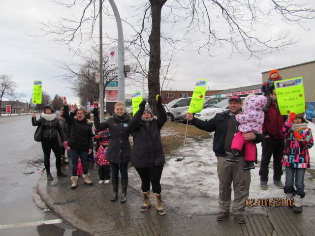 Une cinquantaine de parents, enfants et employés du centre de la petite enfance Les Crayons magiques ont formé une chaîne humaine afin de manifester contre les coupes de 120 M$ annoncées pour 2016-2017.