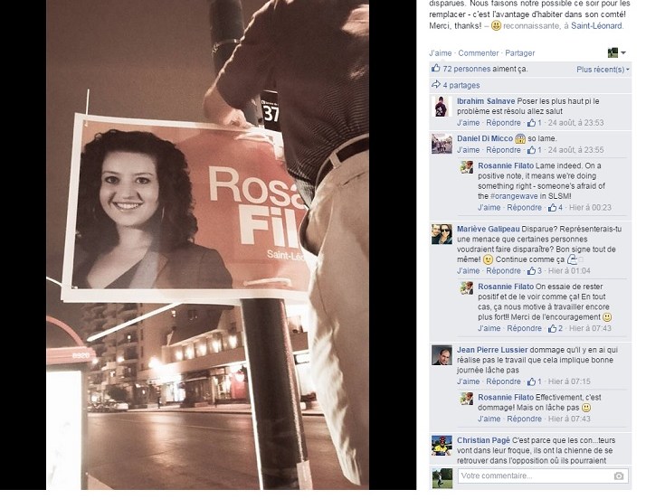 La candidate du NPD aurait été victime d’un larcin au cours des derniers jours alors qu’une quarantaine de ses pancartes électorales se sont volatilisées des poteaux où elles étaient affichées.