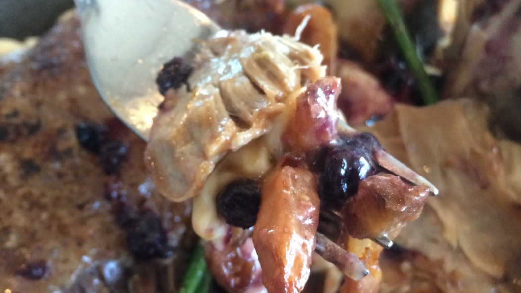 Son plat, conçu pour nourrir deux personnes, est nappé d’une sauce à la bière et au foie gras, d’un jarret de sanglier braisé et d’une cuisse de canard confite.