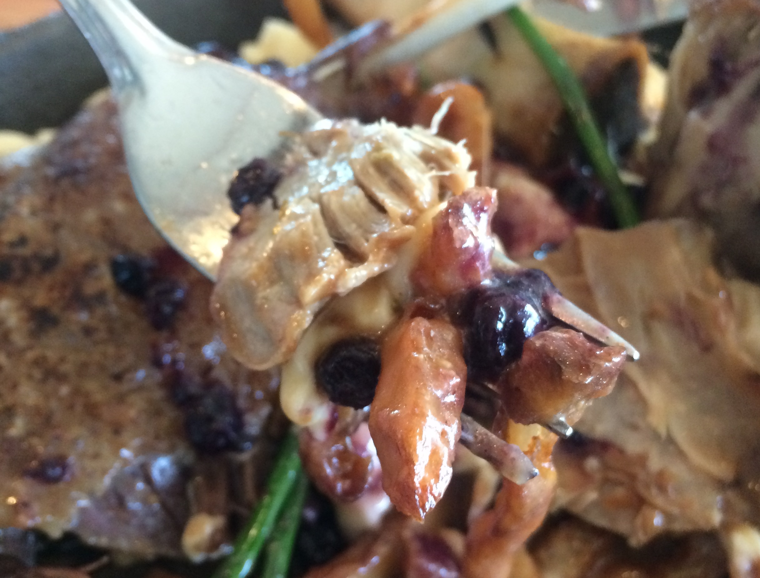Son plat, conçu pour nourrir deux personnes, est nappé d’une sauce à la bière et au foie gras, d’un jarret de sanglier braisé et d’une cuisse de canard confite.