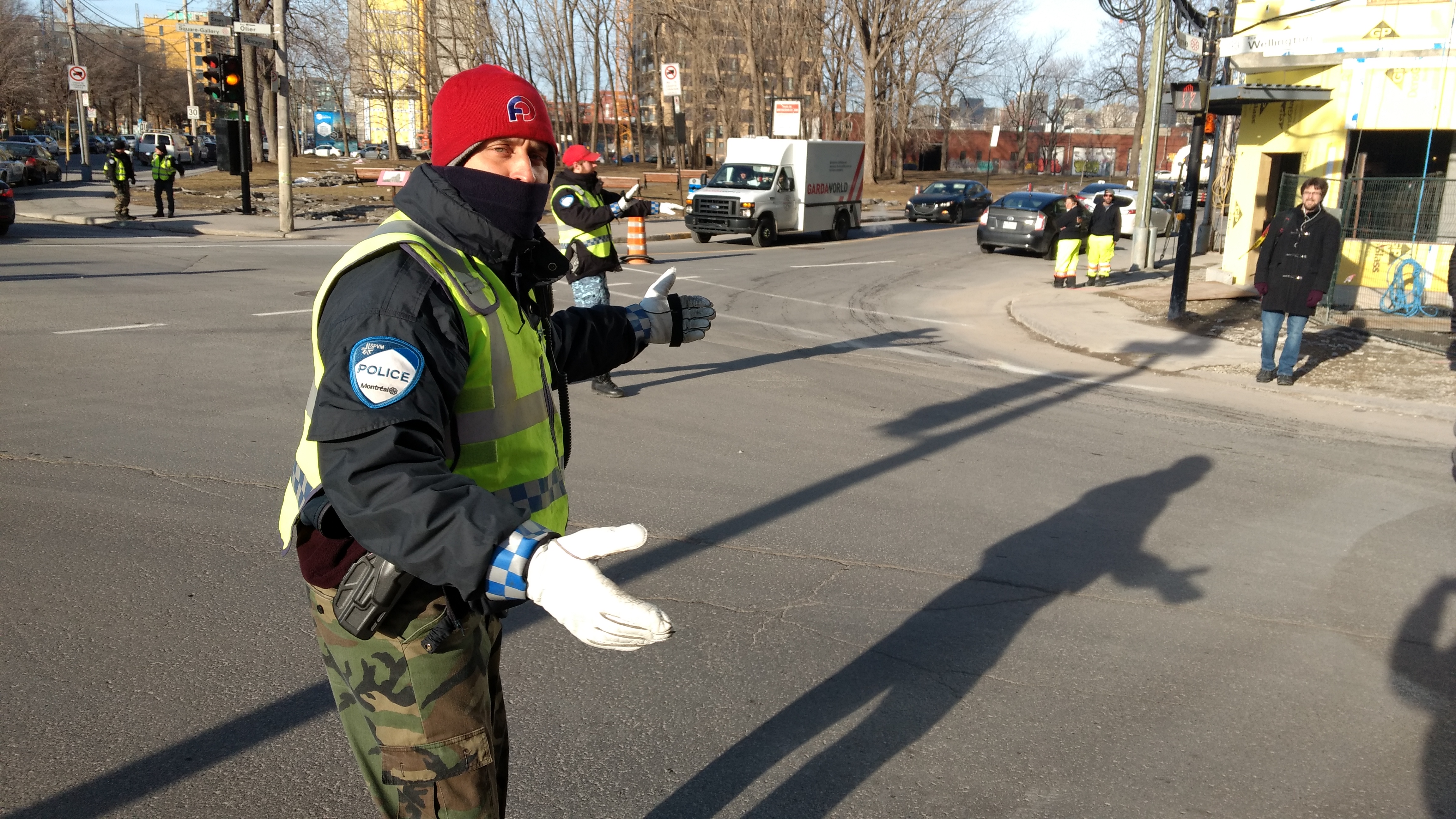 La congestion était semblable à la normale dans le secteur, ce qui a même surpris un des trois agents du Service de police de la ville de Montréal (SPVM) qui guidait les piétons au coin de Wellington et de la Montagne.