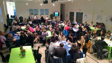 Divisées par table et dirigées par des employés de l’arrondissement, les équipes de cinq à sept personnes étaient appelées à apposer des autocollants sur des feuilles pour identifier les actions et cibles d’action qu’ils considèrent que l’arrondissement devrait prioriser lors de la mise en œuvre du plan à l’automne.