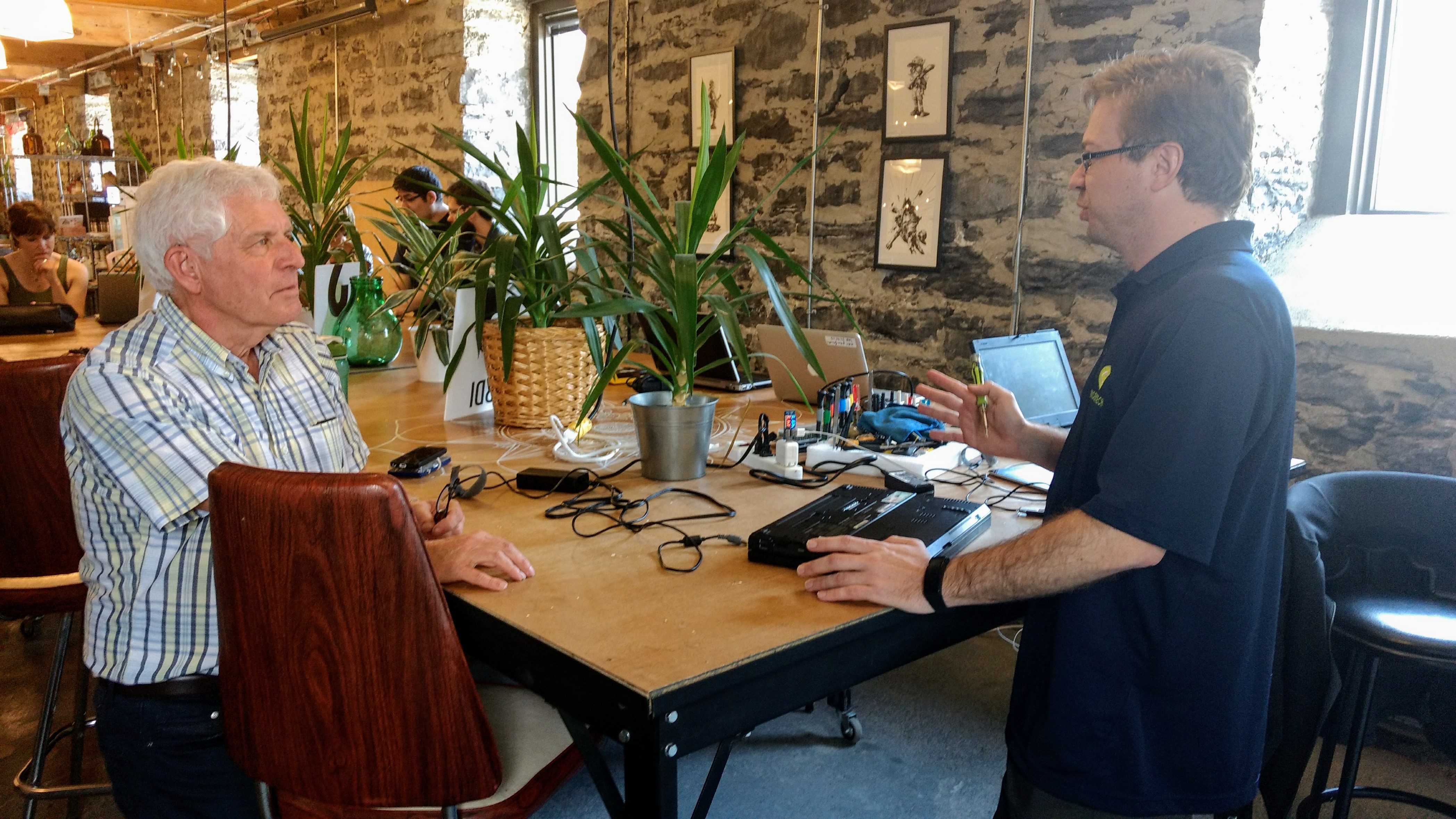 Plus d’une vingtaine de personnes se sont rendues au café Le 5e, situé sur la rue de la Montagne, pour bénéficier de soutien technique gratuit pour leurs ordinateurs, tablettes et téléphones défectueux.