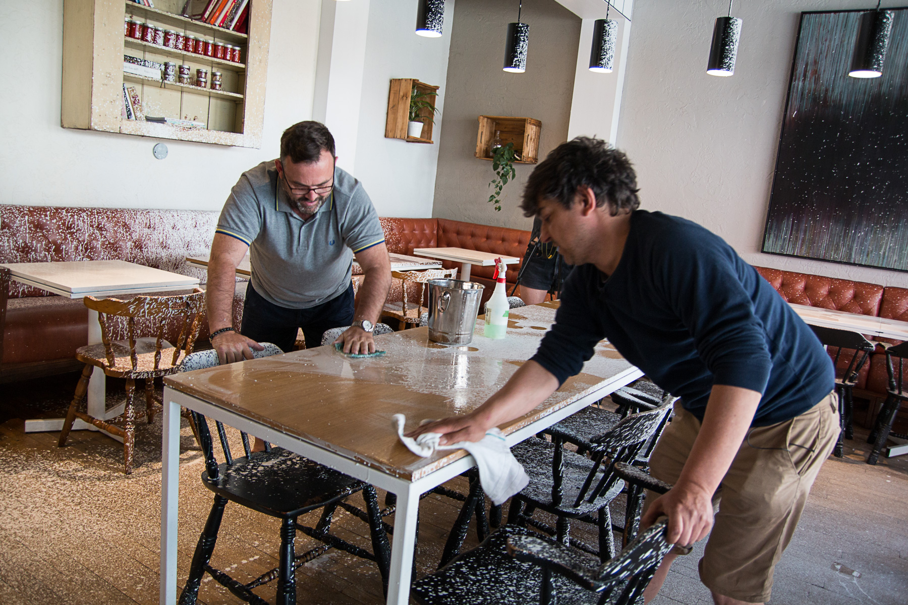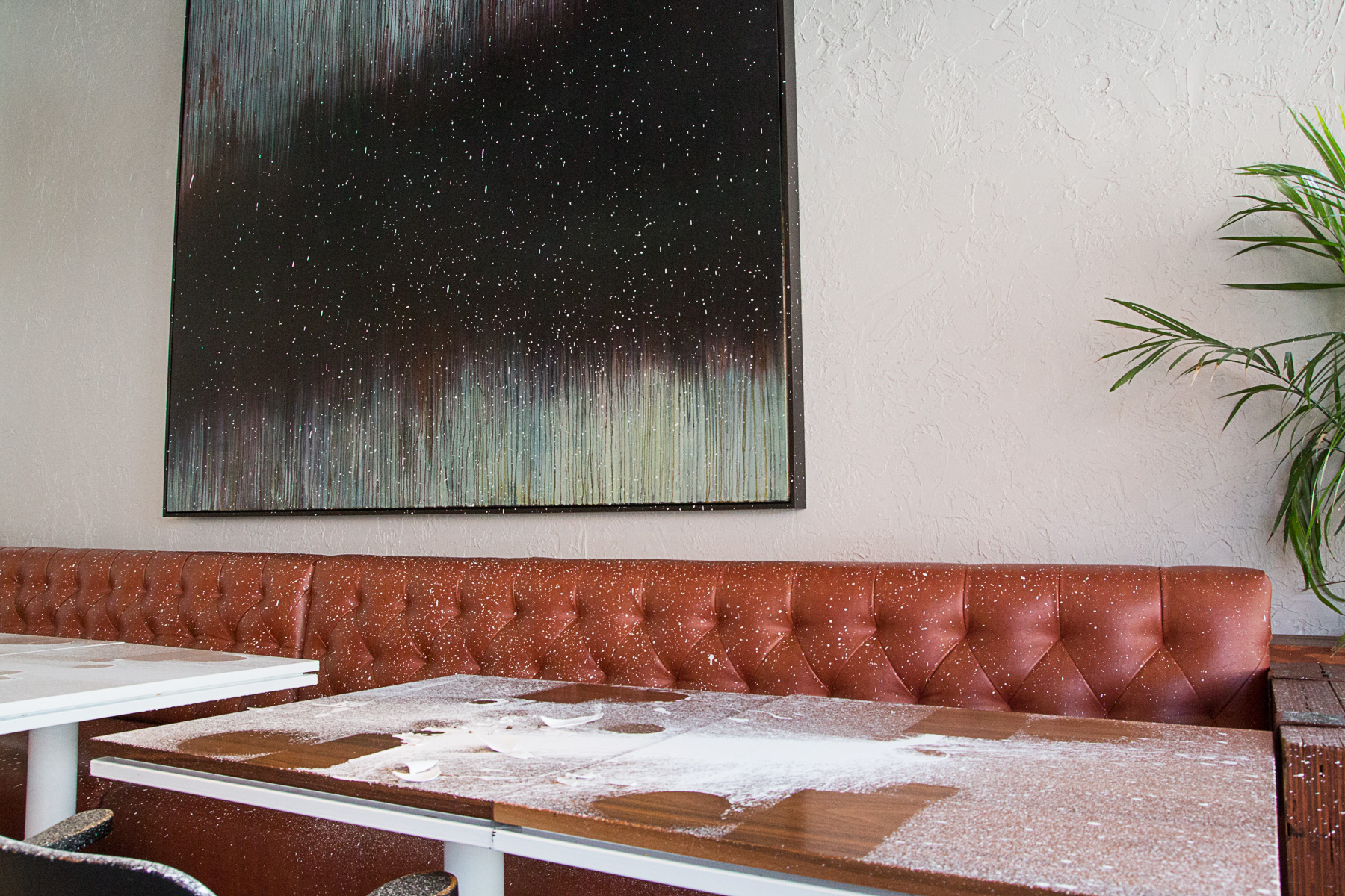 «Les murs, les tables, les ustensiles, les fenêtres et même un œuvre d’art ont été visés. C’est tout blanc. Je dirais même que c’est un peu joli, en fait!», lance Maxime Tremblay, co-propriétaire de l’établissement.