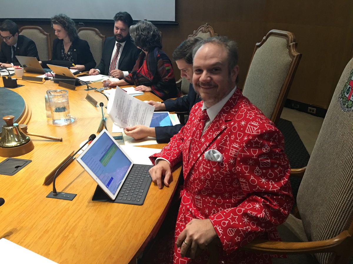 «Comme vous voyez, je suis dans un complet, ma foi, assez inhabituel. J’ai décidé de relever un défi qu’on m’a donné, soit de mettre un complet de Noël pour présider le comité exécutif», a-t-il lancé, mercredi matin.