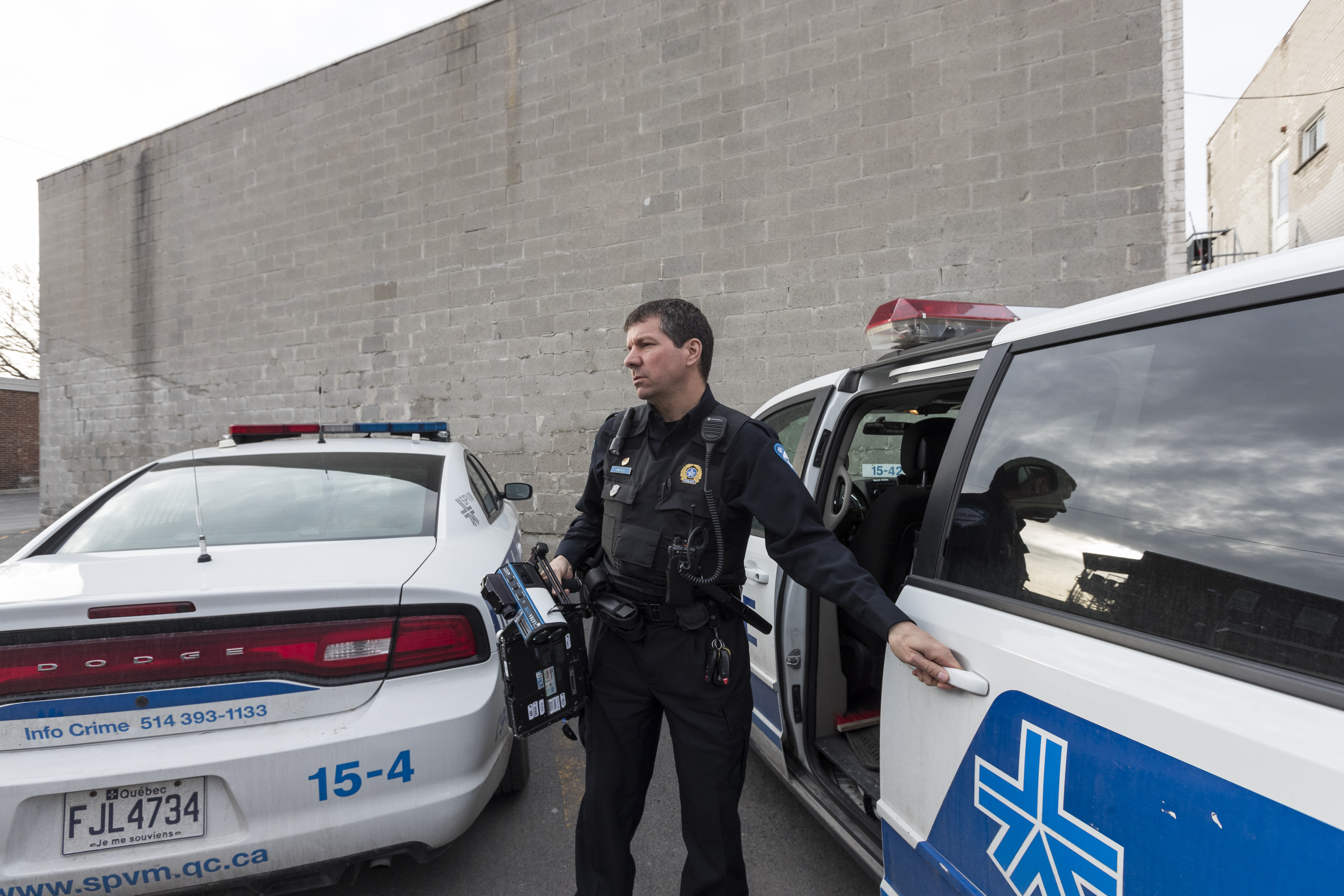 À 14h30, dans la salle commune du poste de l’avenue de l’Église, une quinzaine d’agents sont réunis pour le «fall-in», une réunion où sont résumés les événements majeurs de la journée et où les personnes recherchées sont répertoriées. Puis tous se dirigent vers leur voiture patrouille.