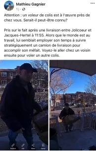 Certains témoignent de leurs mésaventures sur les pages Facebook de l’arrondissement, comme la page Côte St-Paul Ville Emard, où l’on peut notamment lire ce message d’une riveraine: «Je me suis fait voler un colis vendredi 10 décembre secteur Drake/Champigny. Ma voisine aussi. Le paquet a été volé 3 minutes après avoir été déposé. Mon voisin a couru après le voleur, en vain.»