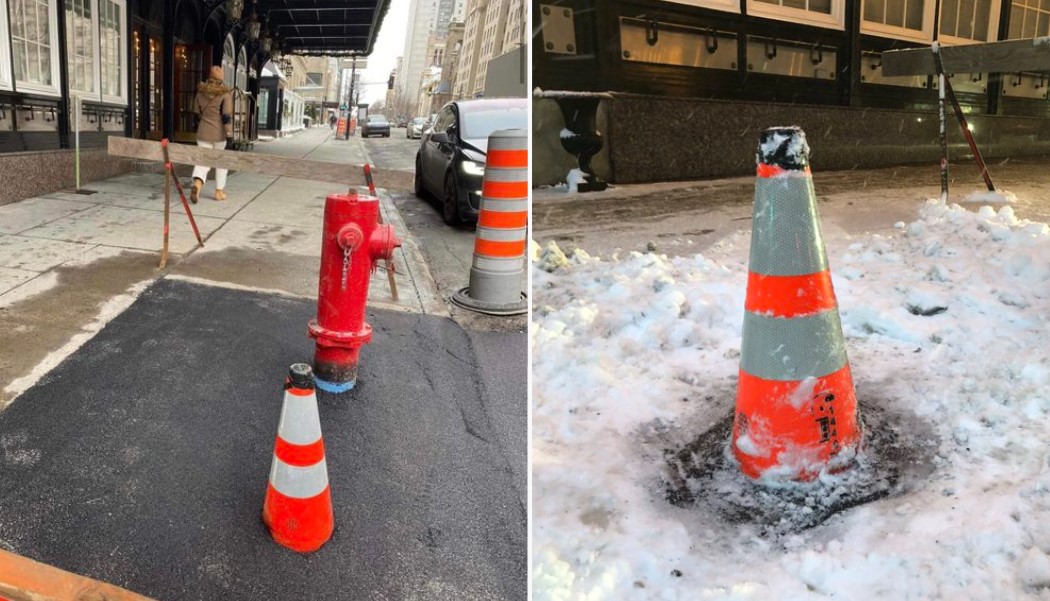 «Un cône orange par-dessus lequel du bitume a été fraichement posé sur le trottoir devant le RitzCarlton de Montréal dans le district Peter-McGill de Montréal. Bien que je sois leur Conseiller de la Ville et qu’on me demande quand il sera enlevé, je ne peux leur répondre», a-t-il déploré.