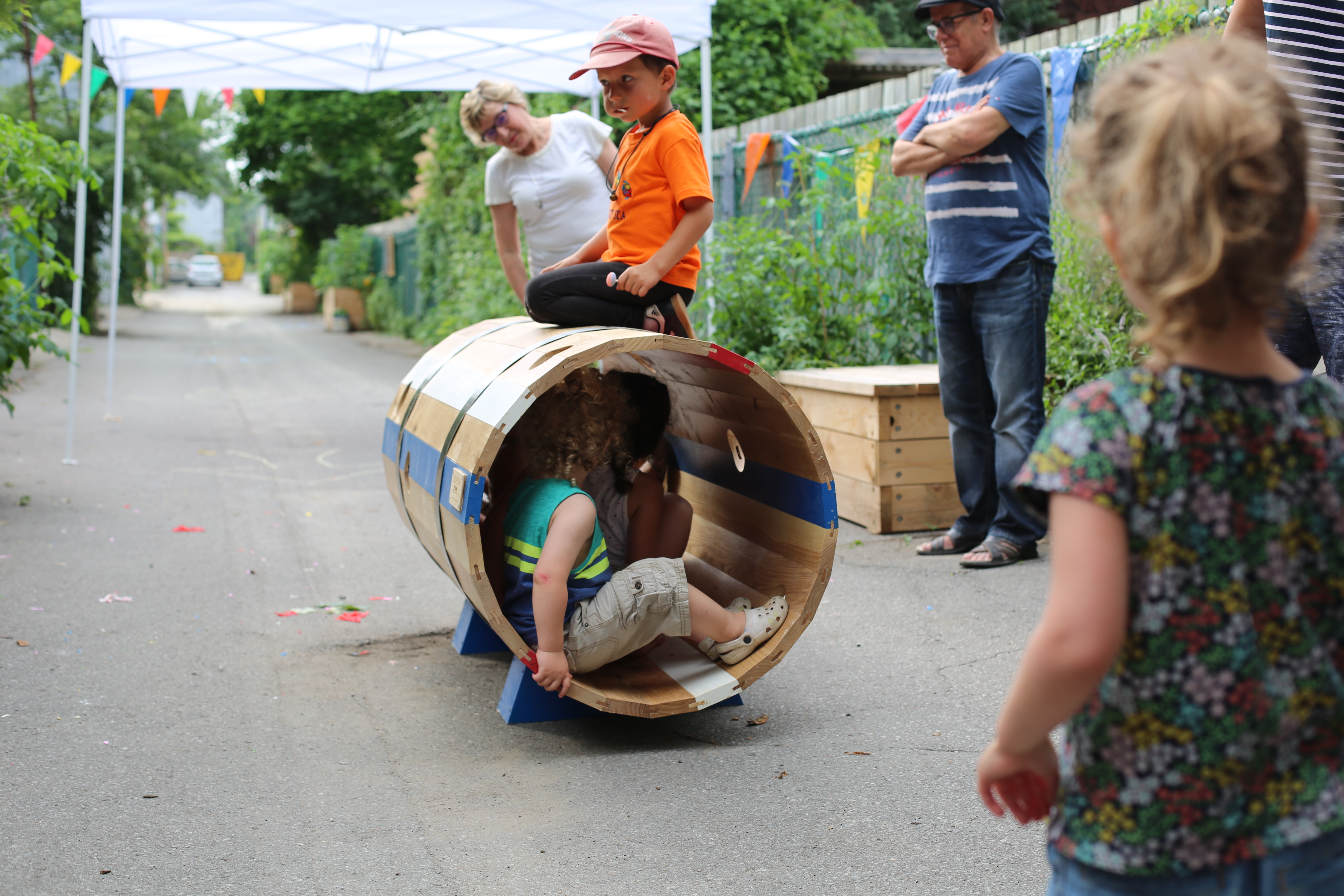 Dans la ruelle du quadrilatère de Gaspé, de Castelnau, Casgrain et Jule-Verne, c’est un tunnel et un jeu de poche qui ont été offerts. Une autre paire de jeu sera axé sur l’équilibre des enfants, avec une estrade avec des dalles sur ressorts et des des planches de traverse du vide.