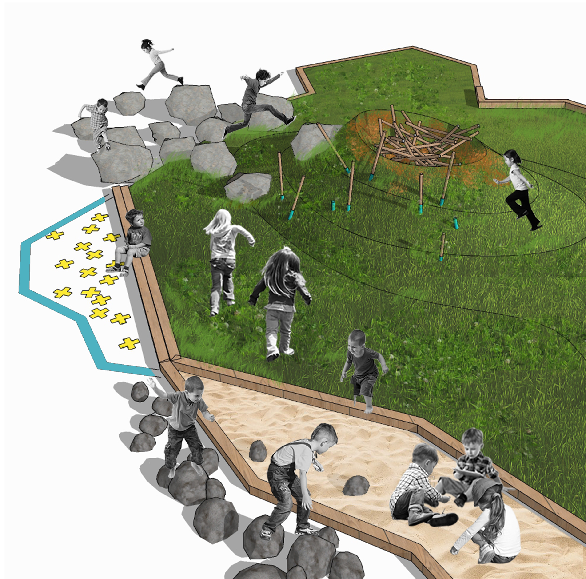 La place publique utilisera des éléments topographiques, tels que des cratères, un bac à sable, des rochers et des buttes pour stimuler les activités chez les petits.