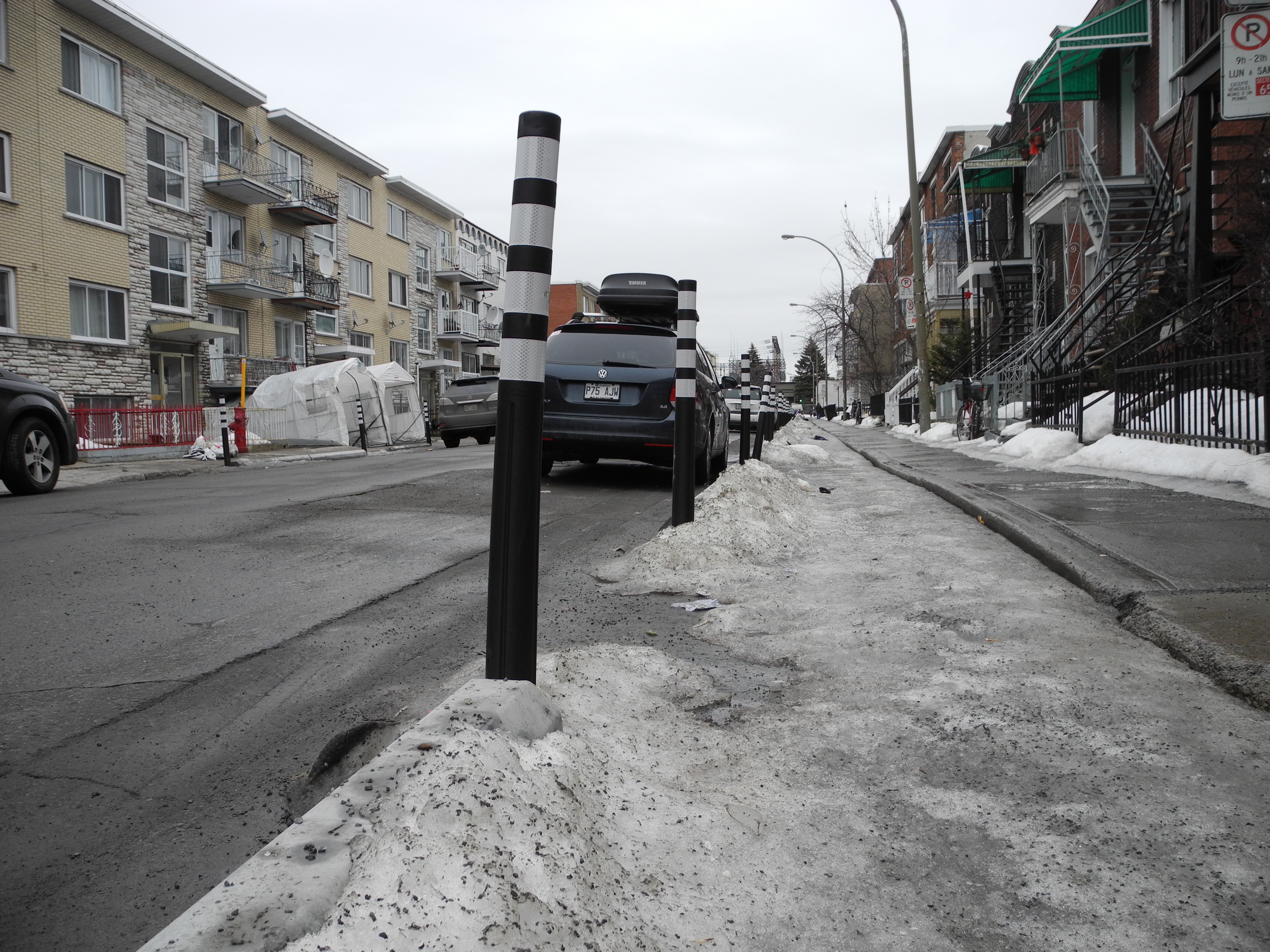 Le nouveau mobilier avait pour but de rétrécir la largeur de la rue afin de régler une problématique de vitesse et d’élargir les trottoirs pour faciliter le dépôt des déchets des résidents lors de la collecte.