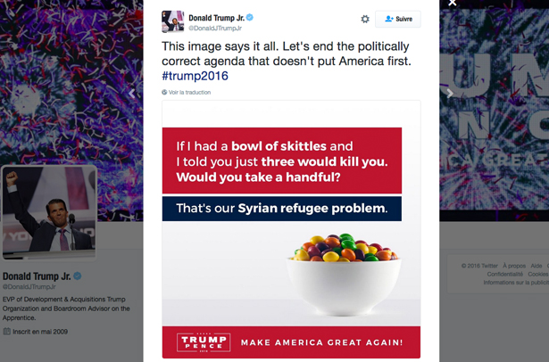 Le photographe de l’image de Skittles que Donald Trump Jr. a utilisée dans un gazouillis où il compare les réfugiés syriens à des bonbons empoisonnés était lui-même un réfugié, a appris la BBC.