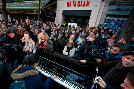 A woman plays piano in front of the Bataclan concert hall in Paris, France, Sunday, Nov. 13, 2016 after a ceremony held for the victims of last year’s Paris attacks which targeted the Bataclan concert hall as well as a series of bars and killed 130 people. (AP Photo/Francois Mori)