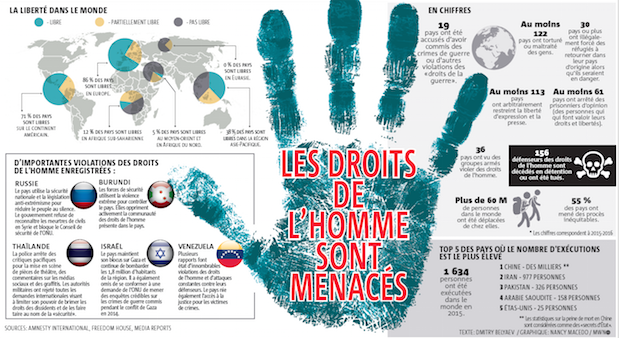 Même si on est au XXIe siècle, les droits de la personne et les libertés civiles sont encore bafoués. La Journée internationale des droits de l’homme, qui est soulignée chaque année le 10 décembre, commémore ce jour de 1948 où l’assemblée générale des Nations unies a adopté la Déclaration des droits de l’homme. Métro propose un coup d’œil sur les droits de la personne dans le monde et montre du doigt les pires délinquants.