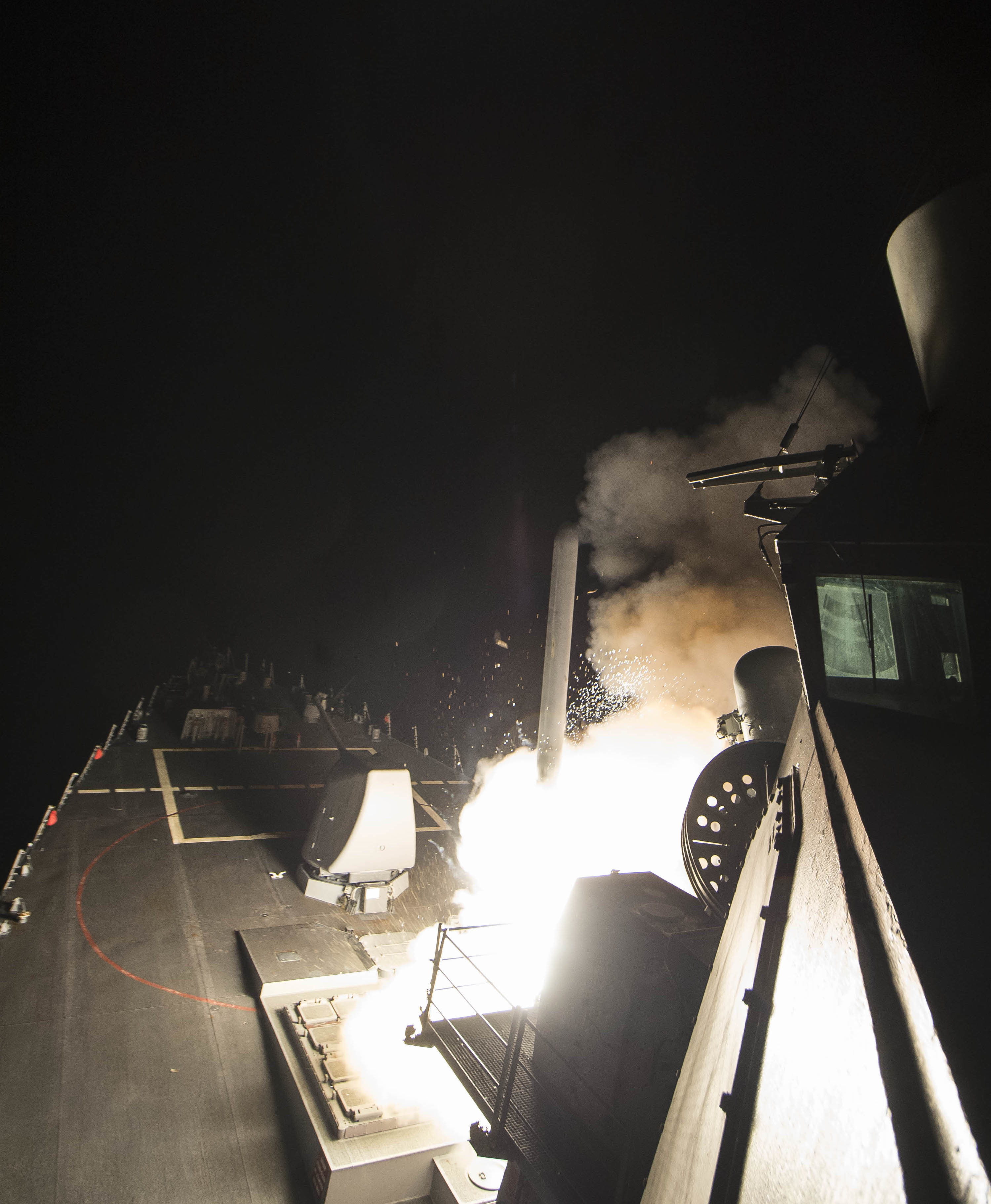 Quelque 60 missiles Tomahawk ont été lancés à 20h45 (heure de Montréal) sur la base aérienne de Shayrat depuis des navires de guerre situés en mer Méditerranée. Selon les autorités américaines, c’est depuis cette base militaire contrôlée par le régime de Bachar el-Assad que se sont envolés les avions qui ont largué des agents neurotoxiques, possiblement du gaz sarin, sur Khan Cheikhoun mardi.