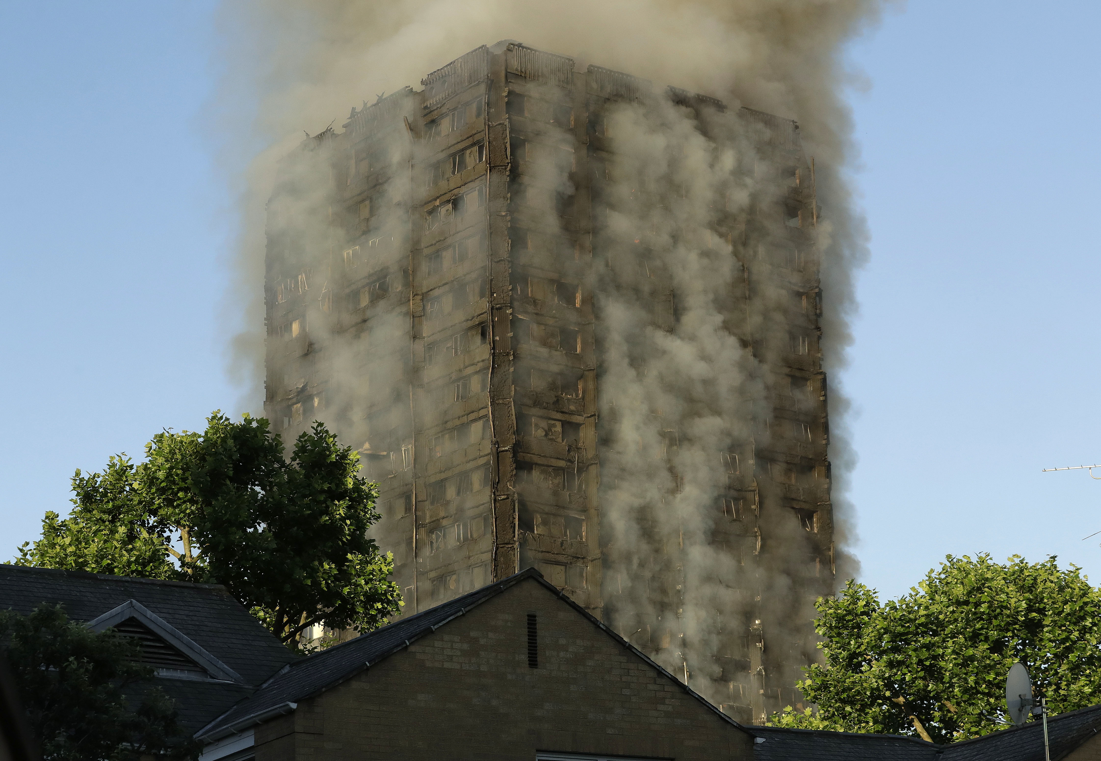 Smoke and flames rise from a building on fire in London, Wednesday, June 14, 2017. Metropolitan Police in London say they’re continuing to evacuate people from a massive apartment fire in west London. The fire has been burning for more than three hours and stretches from the second to the 27th floor of the building.(AP Photo/Matt Dunham)