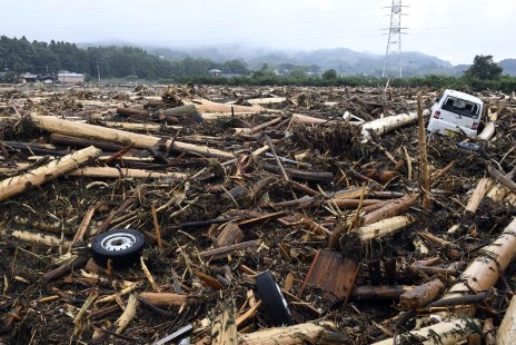 Debris caused by heavy rain are left in Asakura, Fukuoka prefecture, southwestern Japan Thursday, July 6, 2017. Heavy rain following a recent typhoon flooded many houses in southwestern Japan, forcing thousands of people to flee, authorities said. (Sadayuki Goto/Kyodo News via AP)