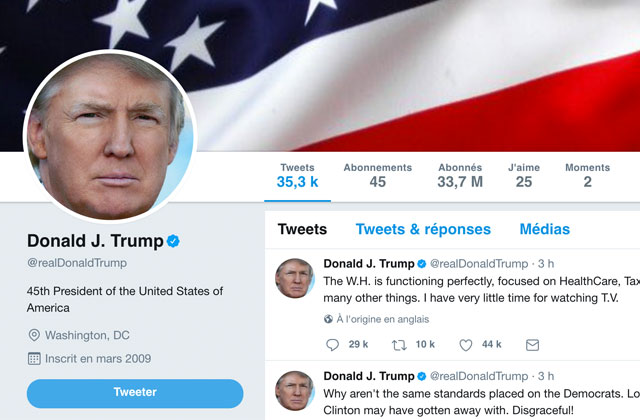 Le compte Twitter de Donald Trump se nomme @realDonaldTrump et rejoint plus de 33 millions d’abonnés.