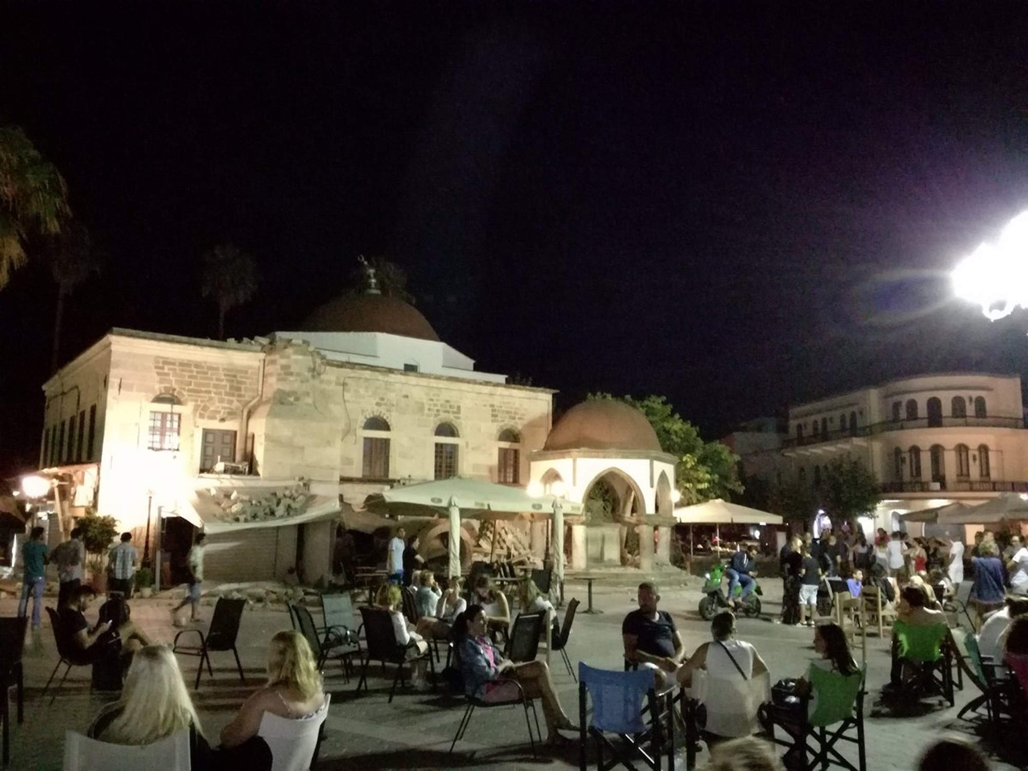 People sit at a square after an earthquake on the Greek island of Kos early Friday, July 21, 2017. A powerful earthquake struck Greek islands and Turkey’s Aegean coast early Friday morning, damaging buildings and a port and killing at least two people, authorities said. (Kostoday.gr via AP)