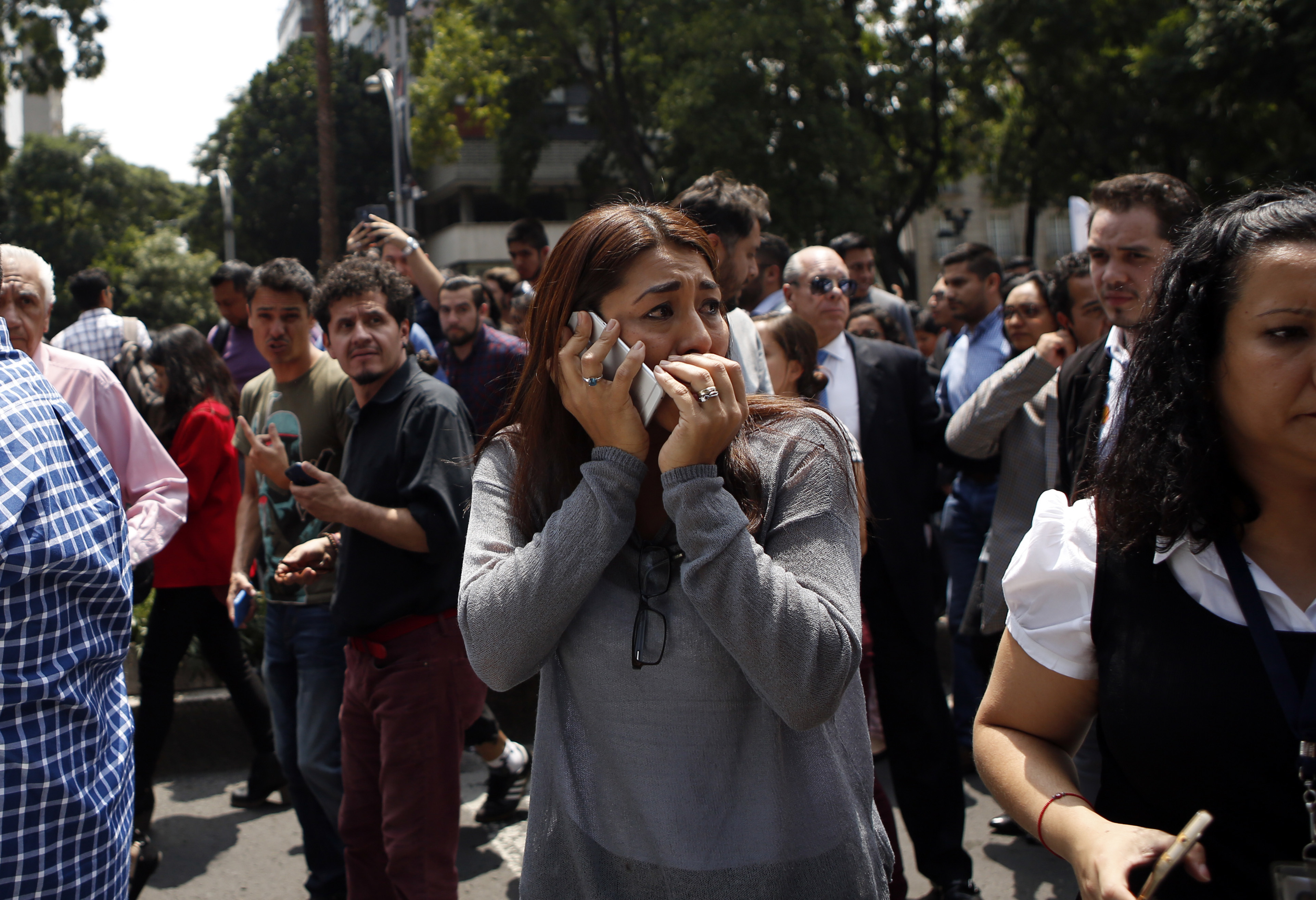 A woman tries to reach people on her cellphone after she evacuated with others to Paseo de la Reforma street after an earthquake in Mexico City, Tuesday, Sept. 19, 2017. A powerful earthquake jolted central Mexico on Tuesday, causing buildings to sway sickeningly in the capital on the anniversary of a 1985 quake that did major damage. (AP Photo/Marco Ugarte)