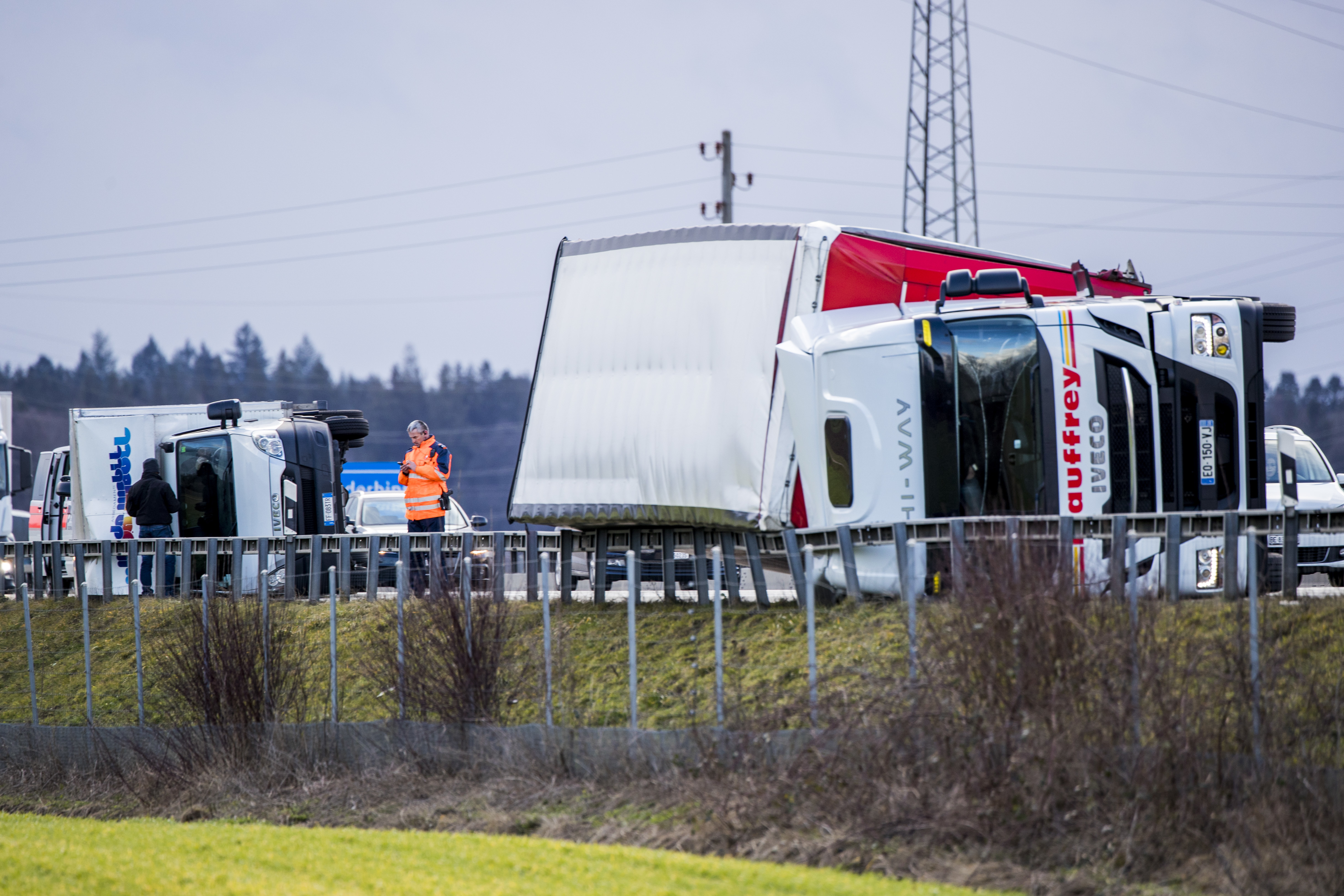 A truck lies on its side and blocks the highway A1 between Oensingen and Niederbipp, Switzerland, Wednesday, Jan. 3, 2018, during heavy winds. The winter storm Burglind has caused damage and traffic disturbances all over Switzerland. (Christian Merz/Keystone via AP)