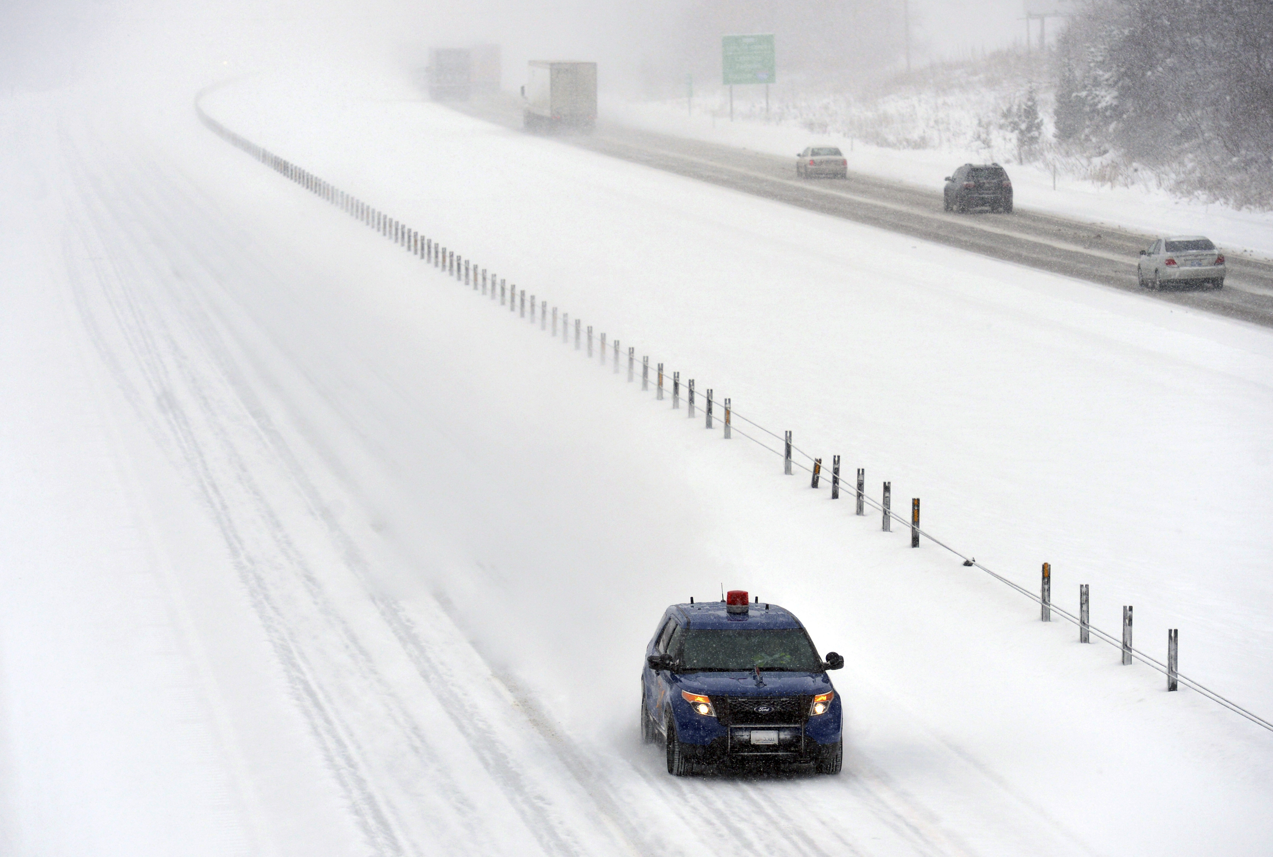 A Michigan State Police vehicle heads down a closed section of eastbound I-94, east of the I-196 exit, while responding to a multi-car accident Wednesday, Jan. 3, 2018, in Benton Township, Mich.(Don Campbell/The Herald-Palladium via AP)