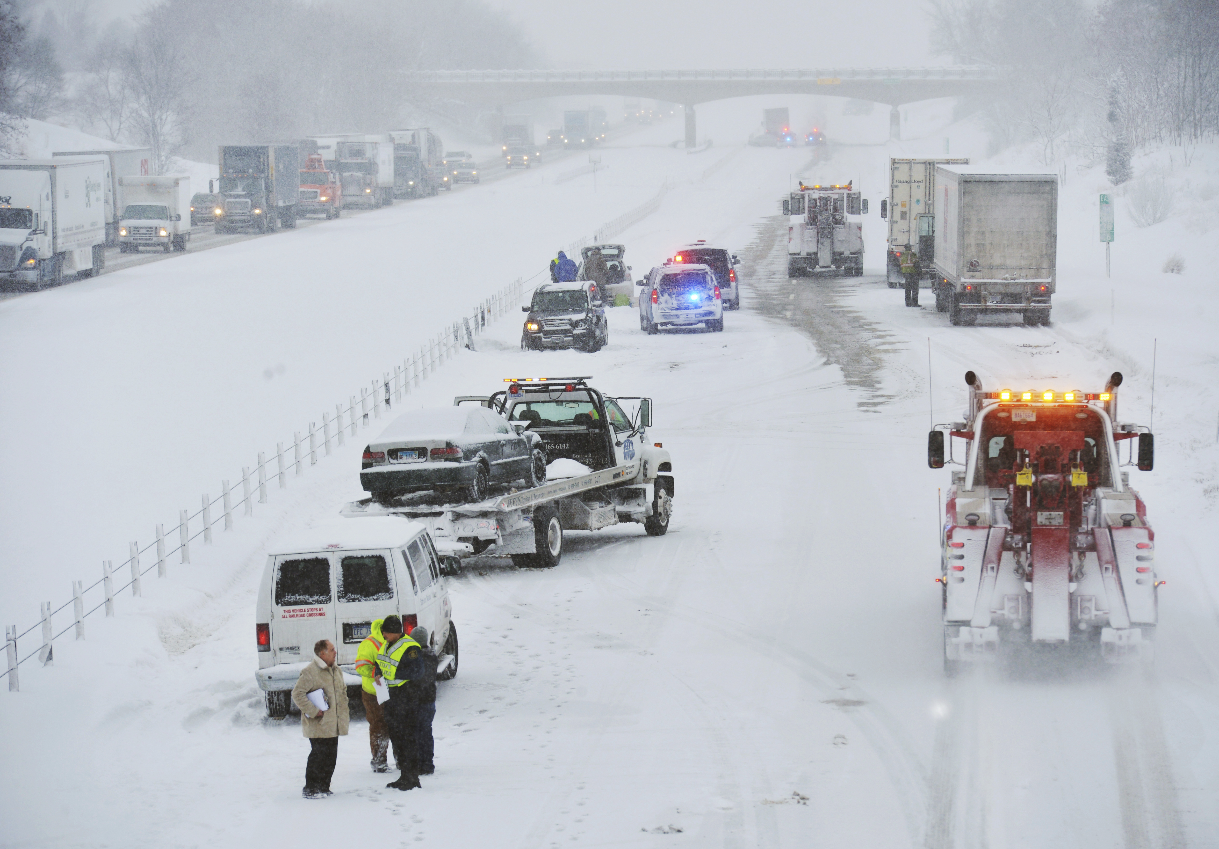 Michigan State Police respond to a multi-vehicle accident along eastbound I-94 between the I-196 and Coloma exits Wednesday, Jan. 3, 2018, in Benton Township, Mich.(Don Campbell/The Herald-Palladium via AP)