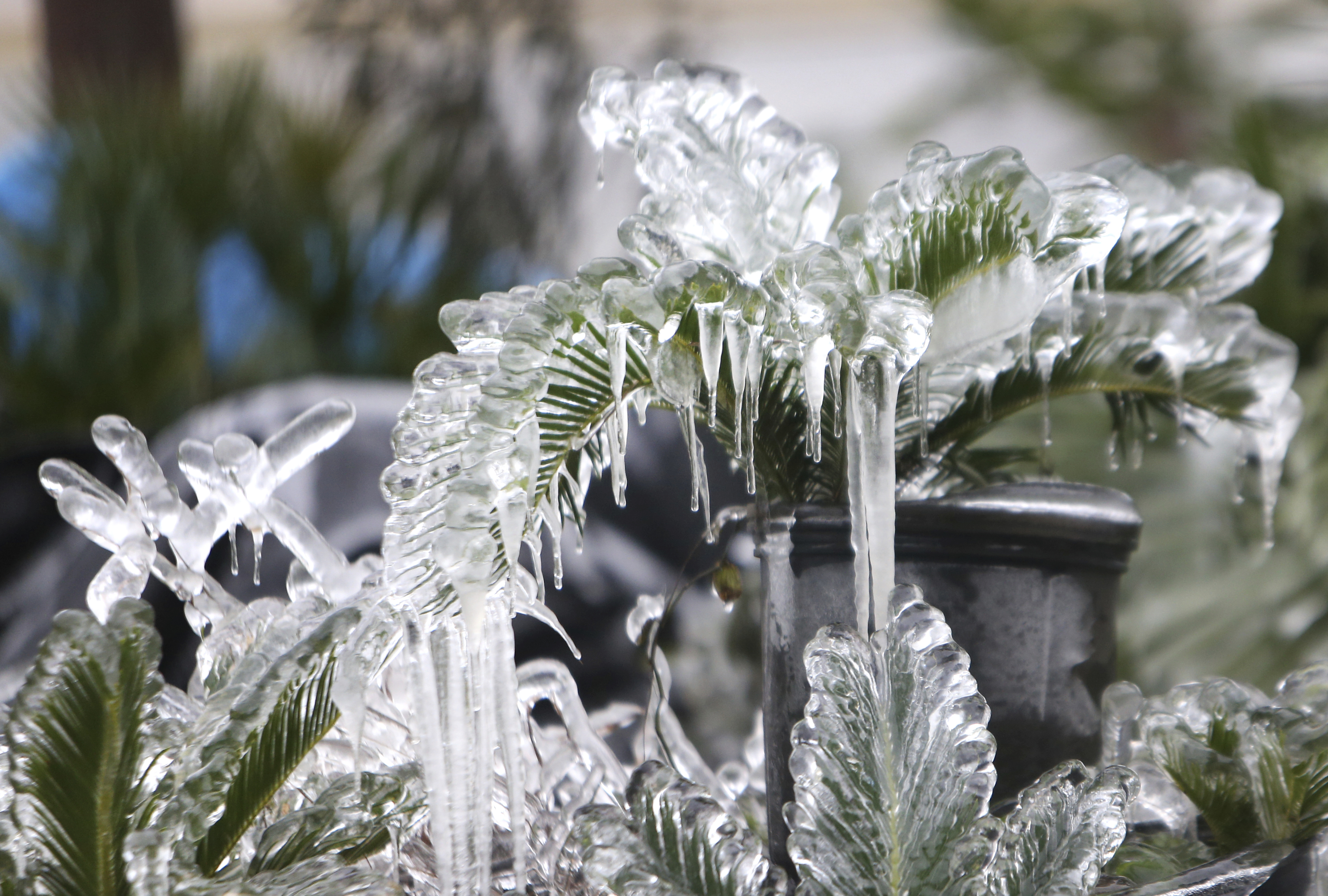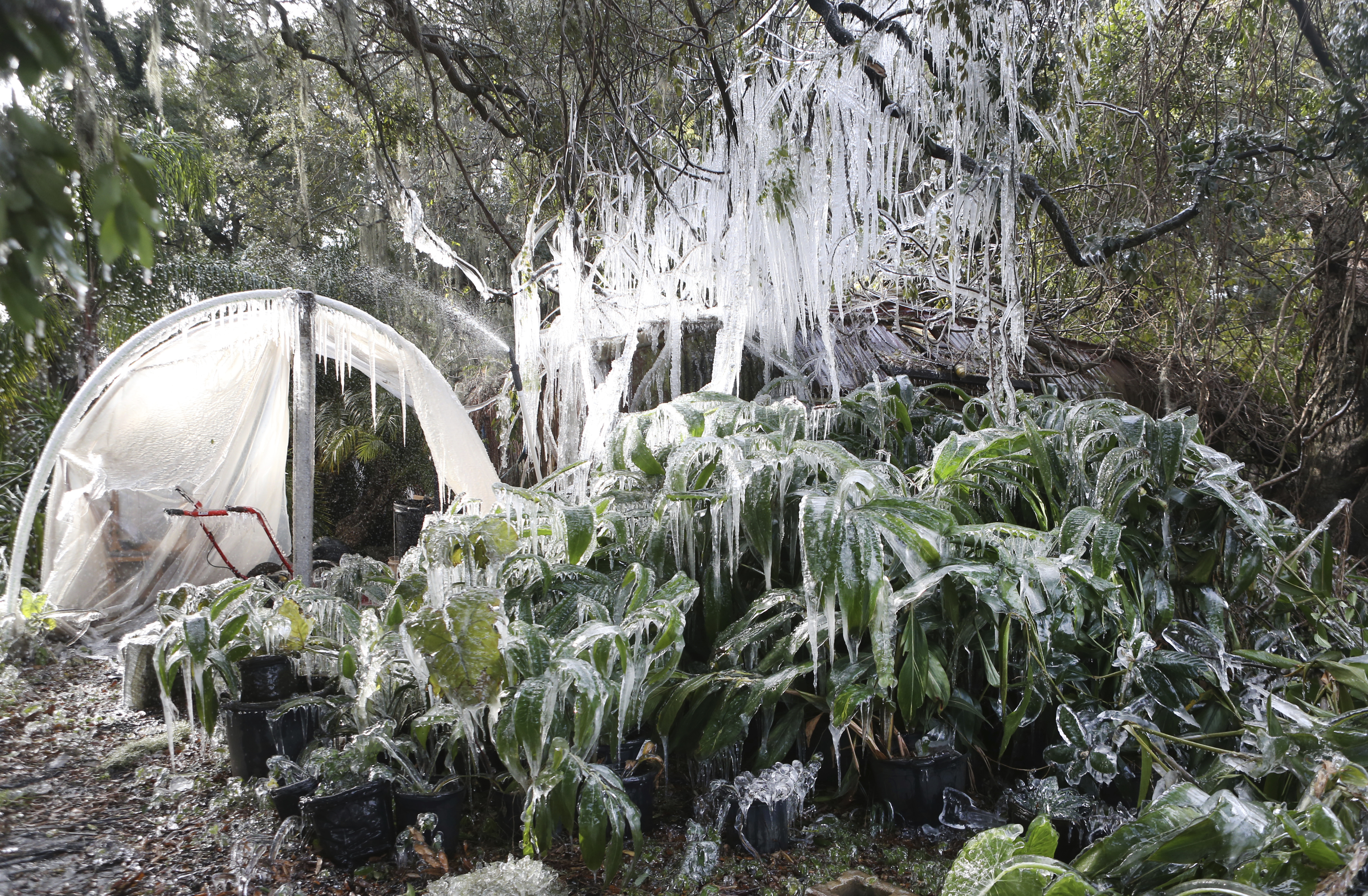 Ice covers various plants on Wednesday, Jan. 3, 2018 at Calo Farms LLC in Panama City, Fla. The plant nursery used an automatic watering system to freeze some of the plants to help protect them from further dropping temperatures. (Patti Blake/News Herald via AP)